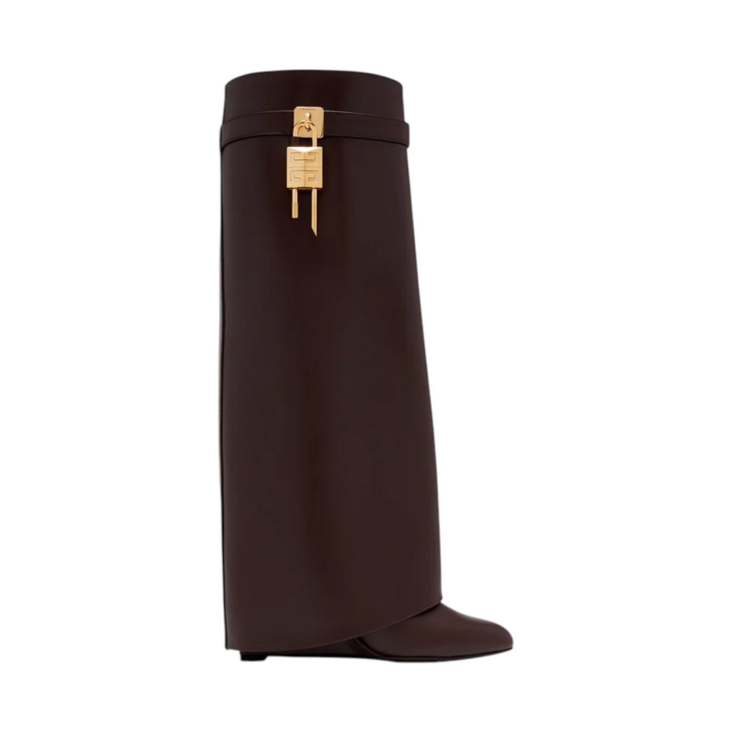 Givenchy Bordeaux Shark Lock Boots. Knee-high boots crafted in smooth bordeaux leather, defined by a sleek and structured silhouette. Featuring a pointed toe and wide shaft design for a bold, contemporary look. The style is completed with the signature gold-tone Shark Lock padlock detail engraved with the Givenchy logo, applied on the upper strap for an iconic finishing touch. A statement piece that combines modern elegance with the distinctive edge of the Maison.