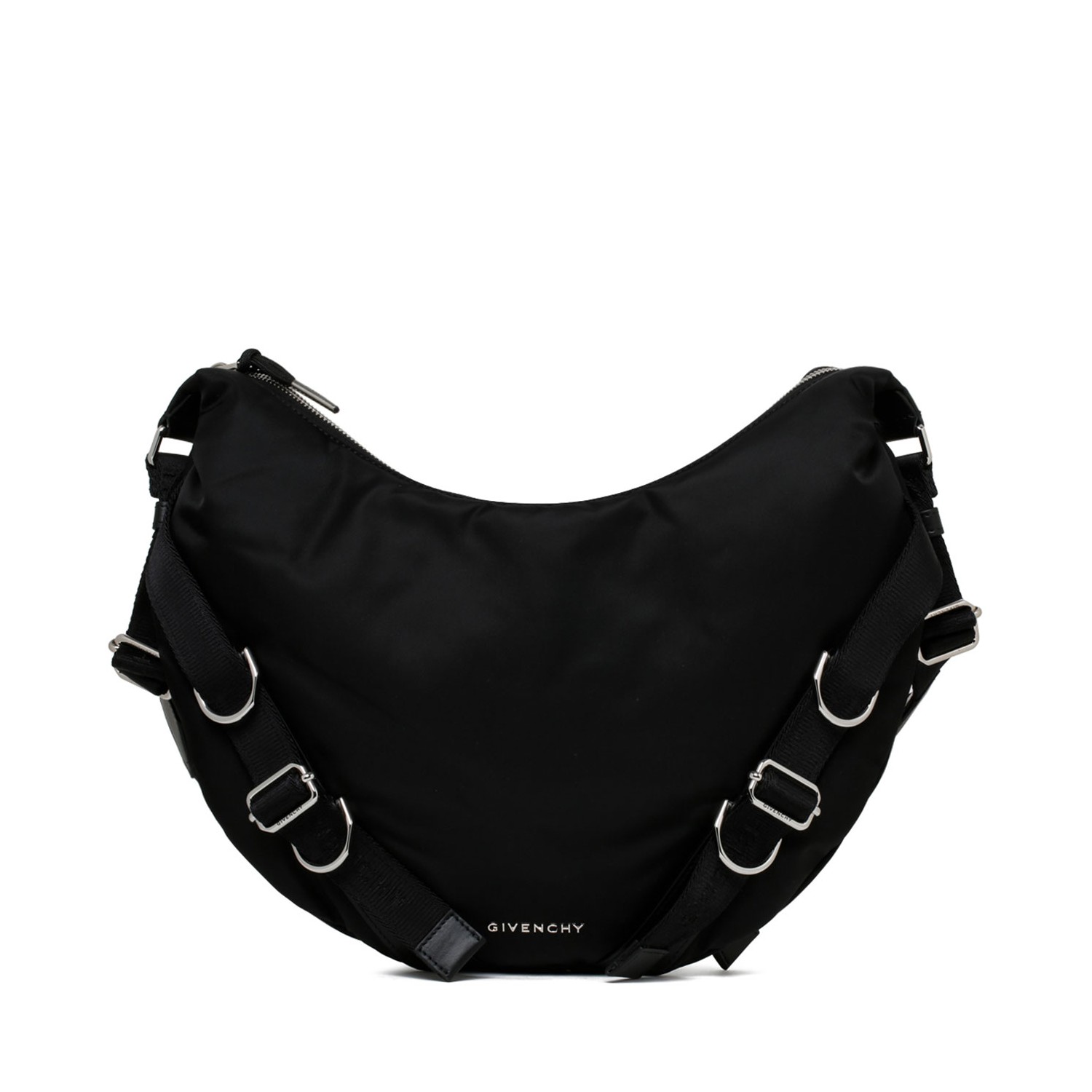 Givenchy Black Voyou Crossbody Bag. Black crossbody bag in nylon, adjustable Givenchy webbing shoulder strap, brand signature engraved metal buckles. Silvery finish metal details, metal Givenchy signature on the front of the bag, one main compartment and one inside flat pocket.