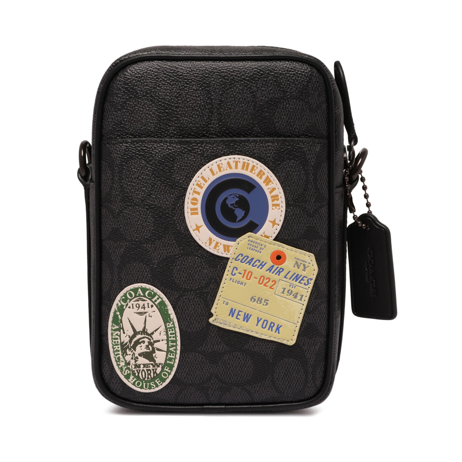 Coach Hitch Signature Canvas Shoulder Bag With Patches. Hitch signature canvas shoulder bag with fine calfskin and smooth leather. Fabric lining removable shoulder strap with a height of 55.2 cm. Open external pockets, internal multifunction pocket, zip closure.