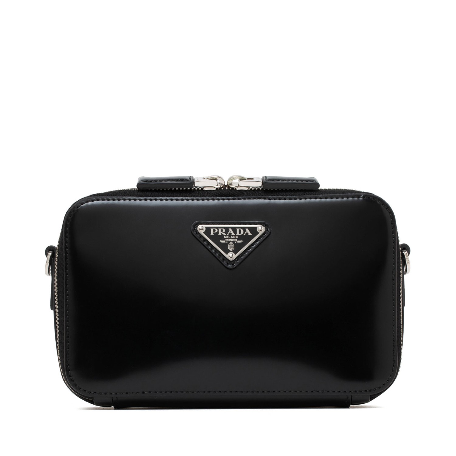 Prada Black Brique Bag. Black brushed leather bag, adjustable and removable leather shoulder strap, enamelled metal triangle logo on the front, zip closure. Interior with patch pocket, branded Re-Nylon lining.