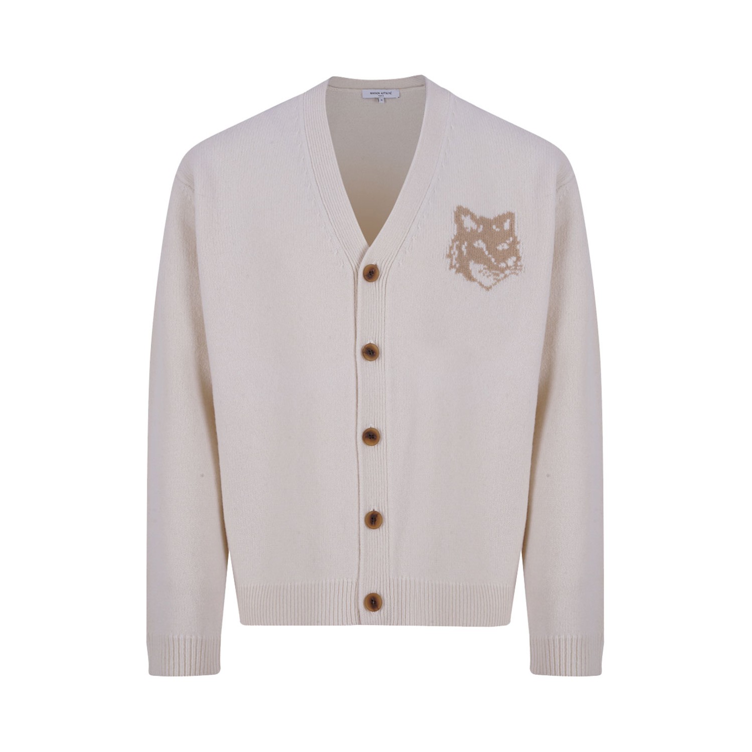 Maison Kitsune Ecru Fox Head Intarsia Merino Cardigan. Ecru fine merino wool cardigan eith comfort fit, V-neck, engraved button closure. Long sleeves, rib finishing at the neckline, cuffs and hem. Fox Head in intarsia at the chest.