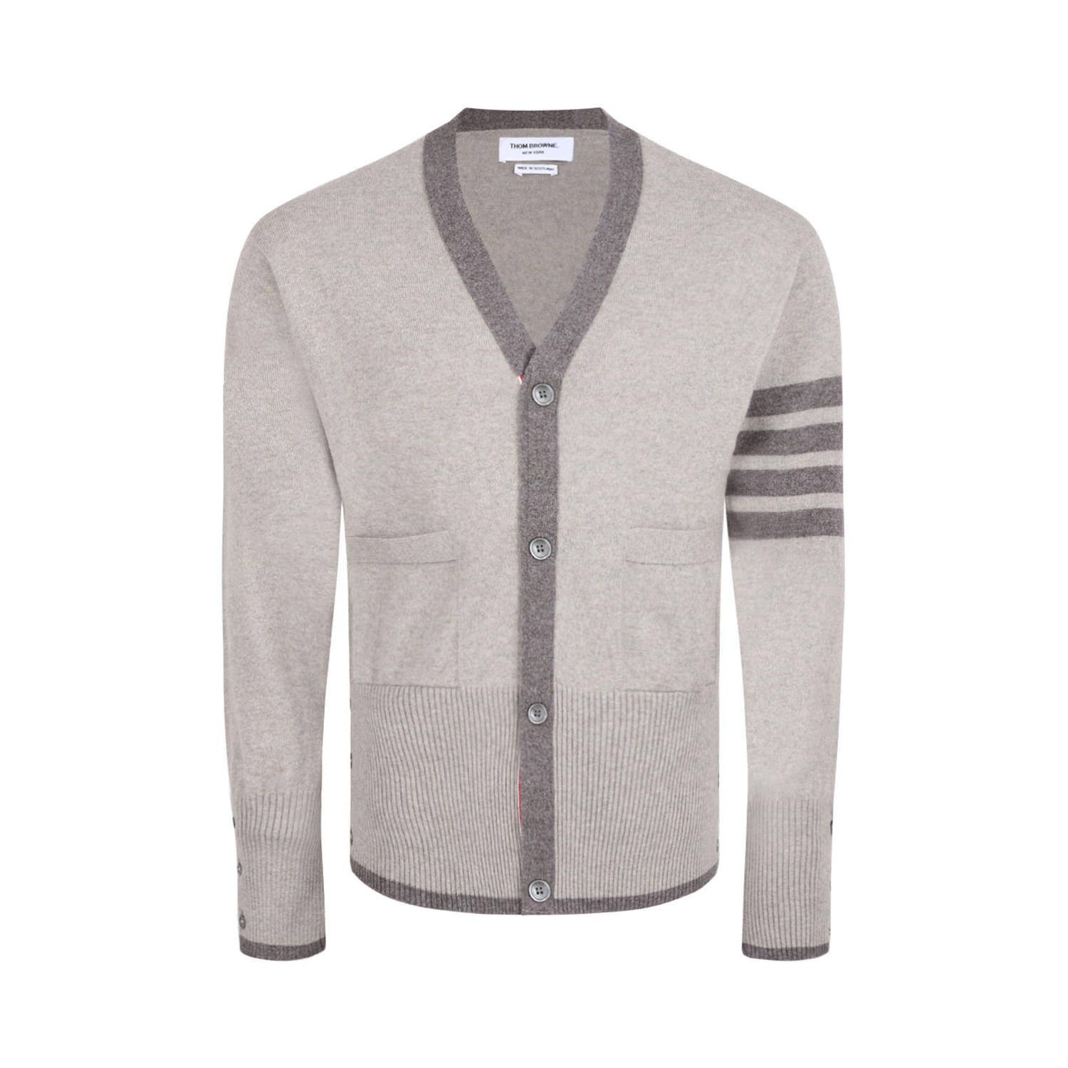 Thom Browne Beige Cardigan. Beige cardigan crafted from soft cashmere, knitted construction, signature 4-Bar stripe. Signature grosgrain loop tab, V-neckfront button fastening, long sleeves and two front patch pockets.
