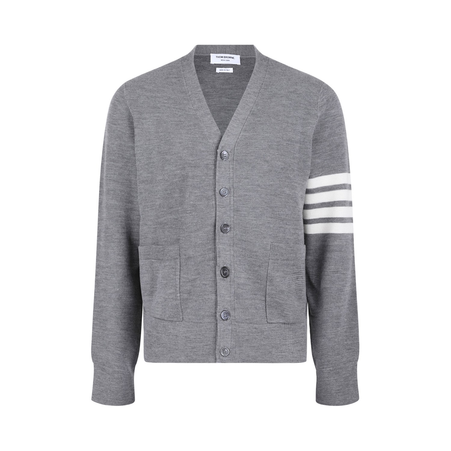 Thom Browne Ash Grey Striped Detail Cardigan. Ash grey virgin wool cardigan with ribbed detailing, stripe detailing, V-neck. Front button fastening, long sleeves, two front patch pockets.