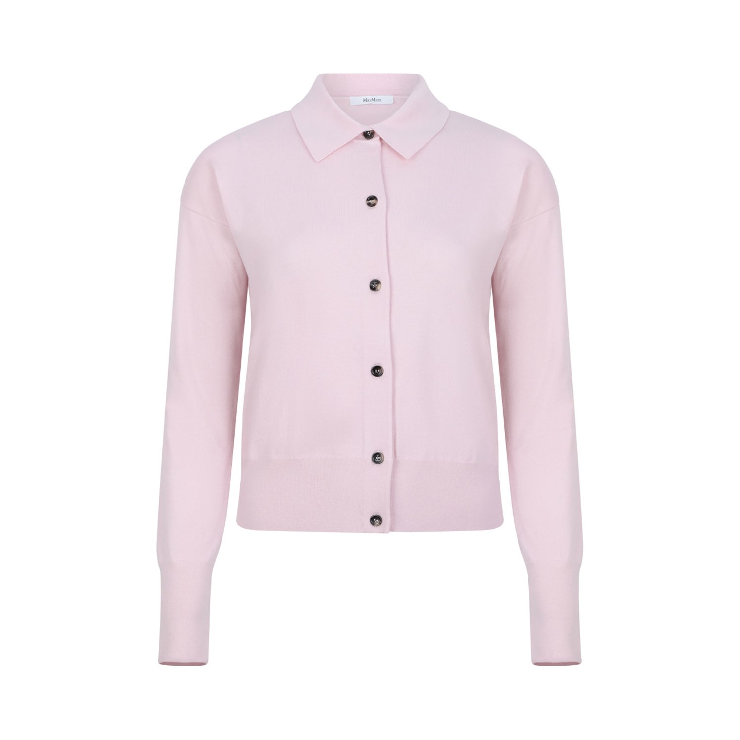 Max Mara Pink Wool Cardigan. Pink crop cardigan with a feminine silhouette and a slightly cropped cut at the waist, shirt collar. Long sleeves with dropped shoulders, closure with personalized horn buttons, ribbed cuffs and bottom.