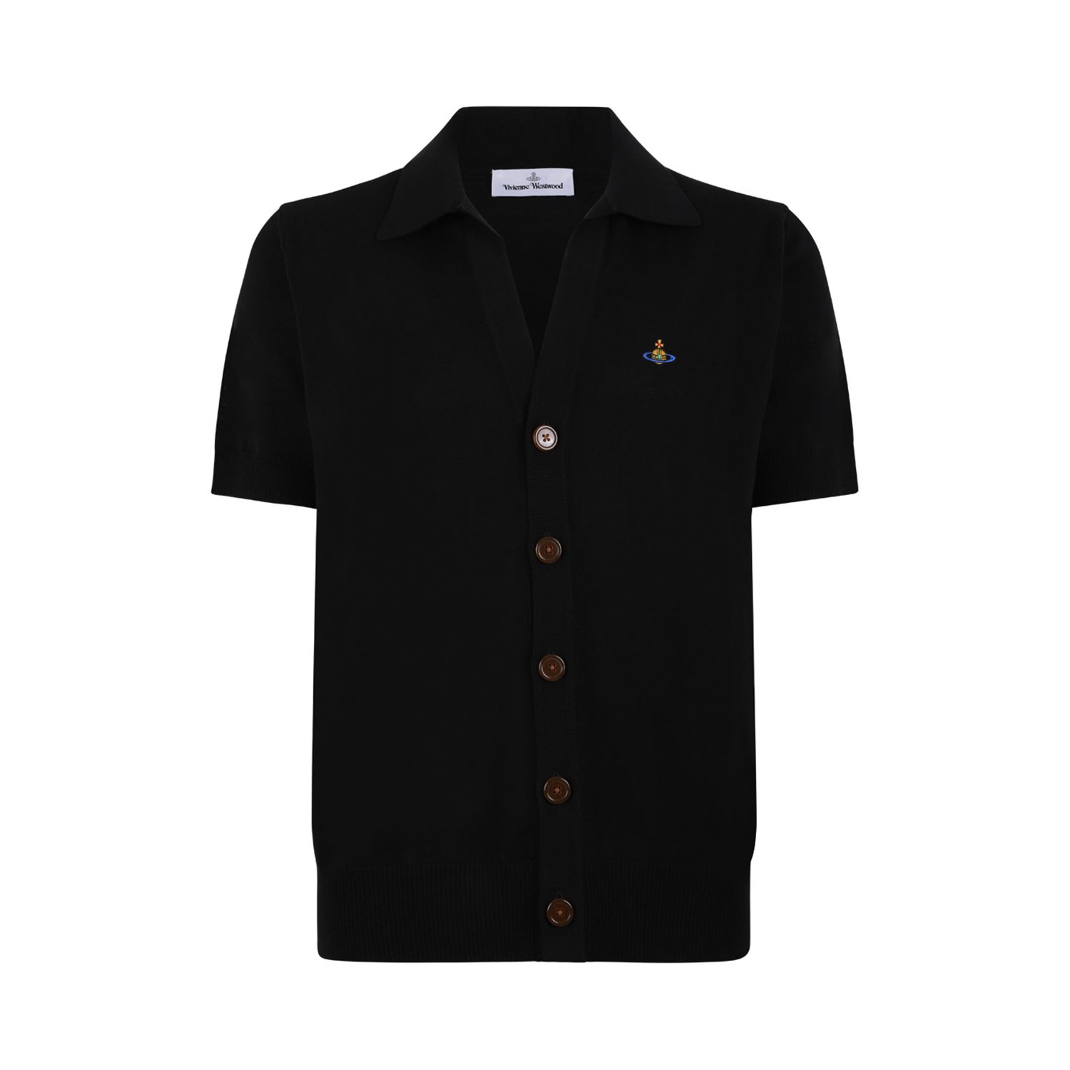 Vivienne Westwood Black V-Neck Cardigan. Black cotton cardigan, polo type collar, short sleeves, V neck, front button fastening, logo Orb to the chest.