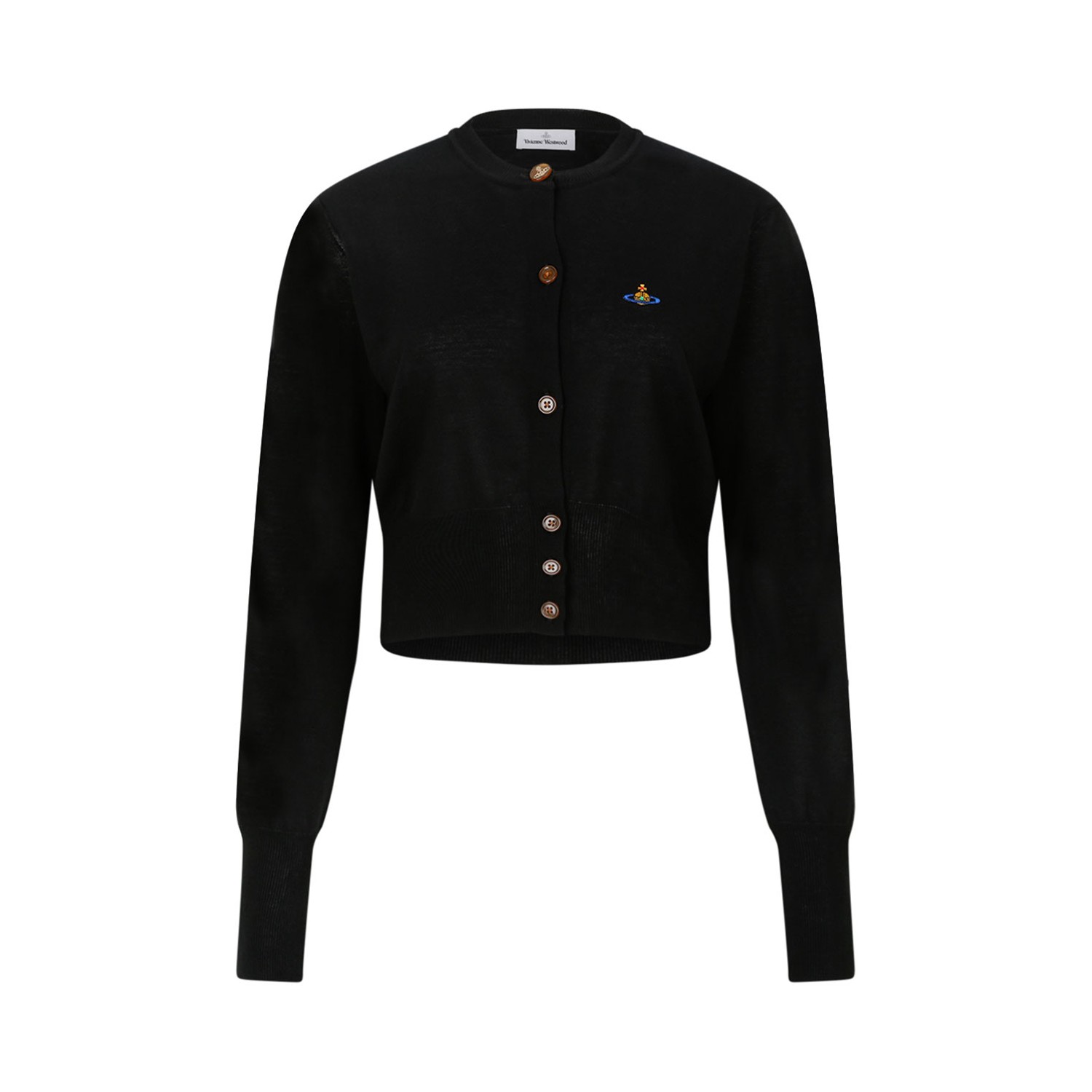 Vivienne Westwood Black Bea Cropped Cardigan. Black Bea cropped cardigan with button fastening, round collar, ribbed finishes. Ankle length, straight hem, long sleeves, classic Orb embroidery.