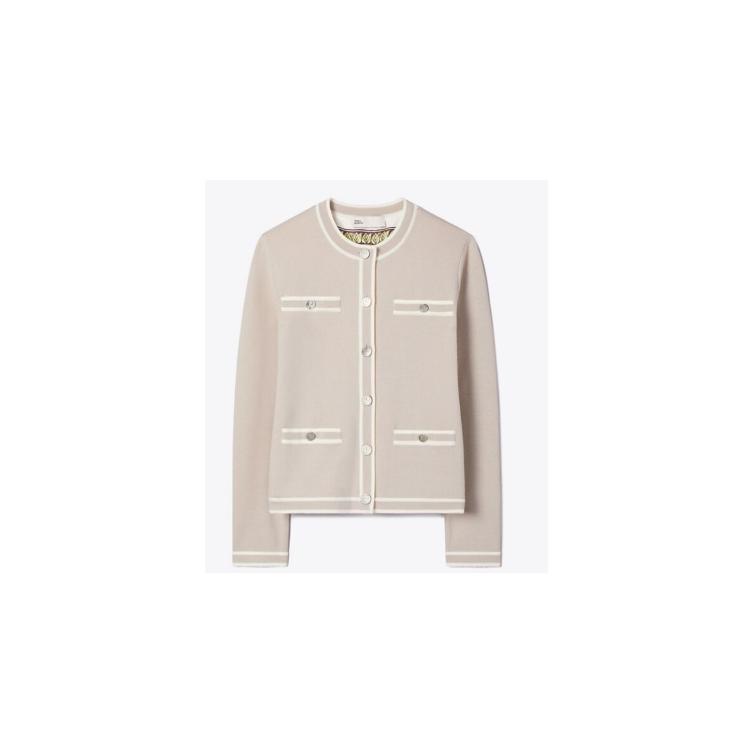 Tory Burch Gray and New Ivory Kendra Merino Wool Cardigan. Refined and timeless, the Kendra cardigan is crafted in soft merino wool and defined by elegant contrast trims in New Ivory. The clean, structured silhouette features a round neckline and front button closure, complemented by decorative buttoned patch pockets that enhance its polished aesthetic. Subtle contrast edging along the neckline, placket, hem, and cuffs adds graphic definition, while the silk lining ensures comfort and a luxurious feel. Perfect for layering, this sophisticated cardigan transitions effortlessly from elevated daywear to chic office styling.