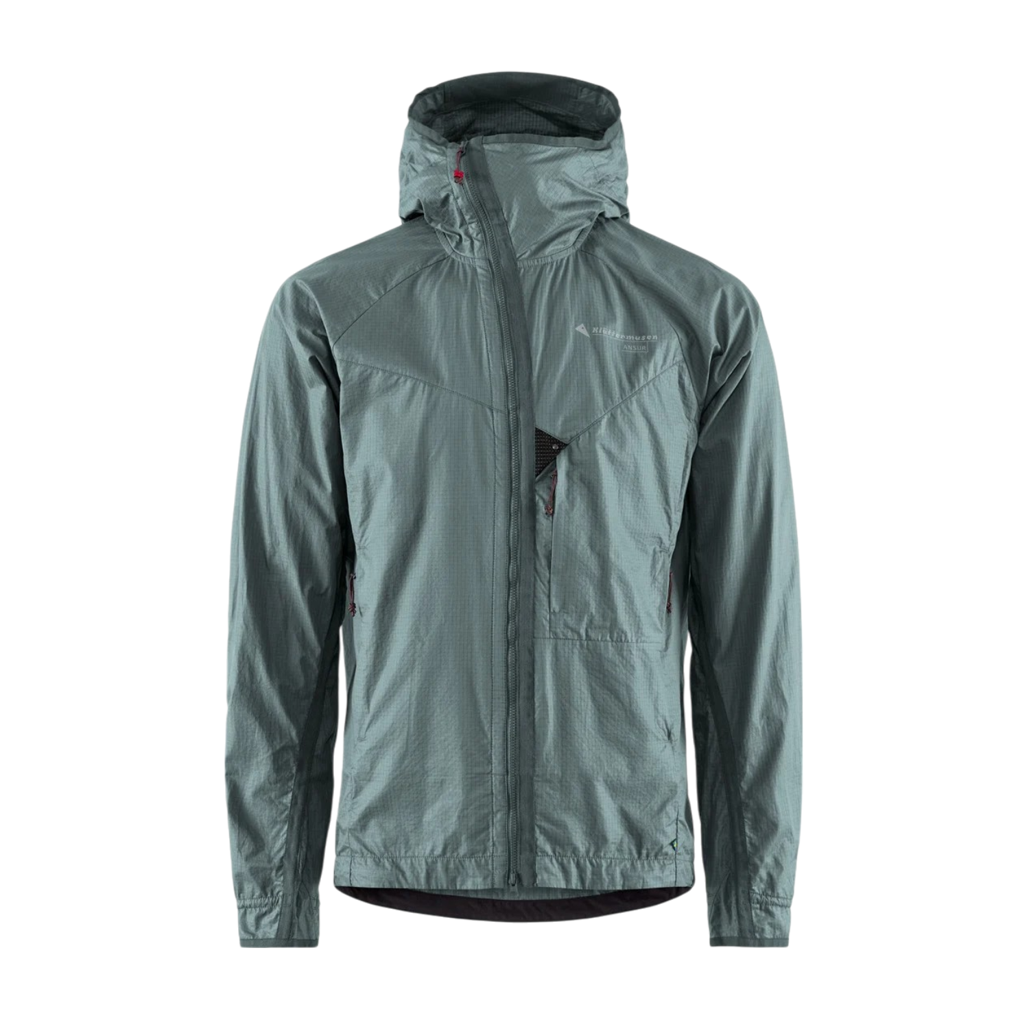 Klattermusen Stone Blue Ansur Wind Jacket. Stone blue hooded wind jacket with 3D ajdustable hood with brim. high placement of pockets, adapted for backpack or harness. Extended sleeve ends, adjustable and elastic bottom hem. Abrasion free interior using external seam allowance, neck lined with brushed tricot for comfortable coverage.