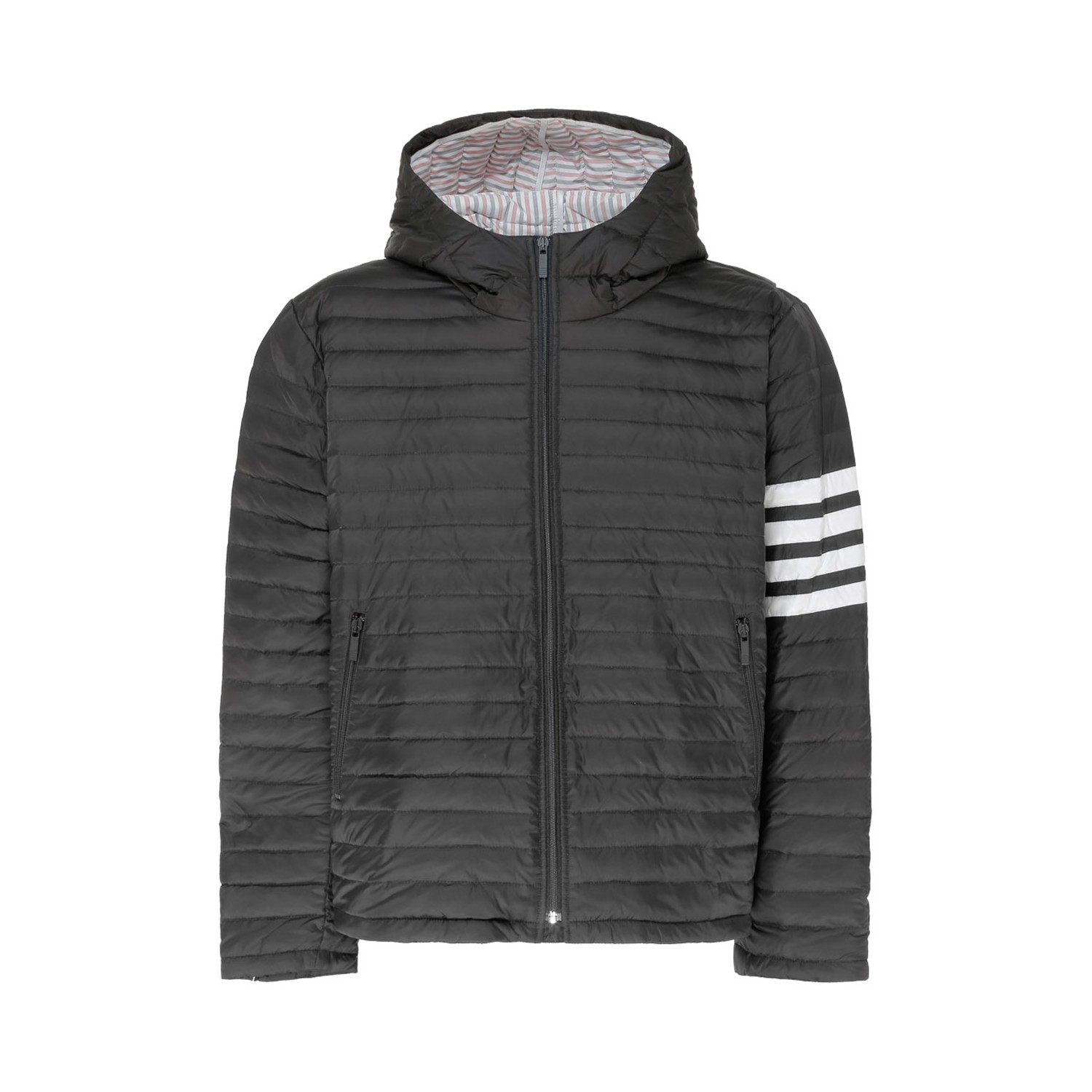 Thom Browne Black Padded Jacket. Black feather down padded jacket, signature 4-Bar stripe draws the eye. Featuring a hood, a front zip fastening, long sleeves, button cuffs, front zipped pockets, front zipped pockets, a printed lining and a 4-Bar stripe.