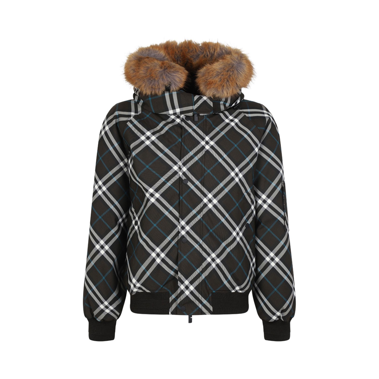Burberry Multicolour Check Bomber Jacket. Twill multicolor checked bomber jacket padded with down and goose feathers. Faux fur trim on hood. Zip and snap button fastening, zip pocket on sleeve and side pockets with button fastening. Ribbed trim. Oversize fit.