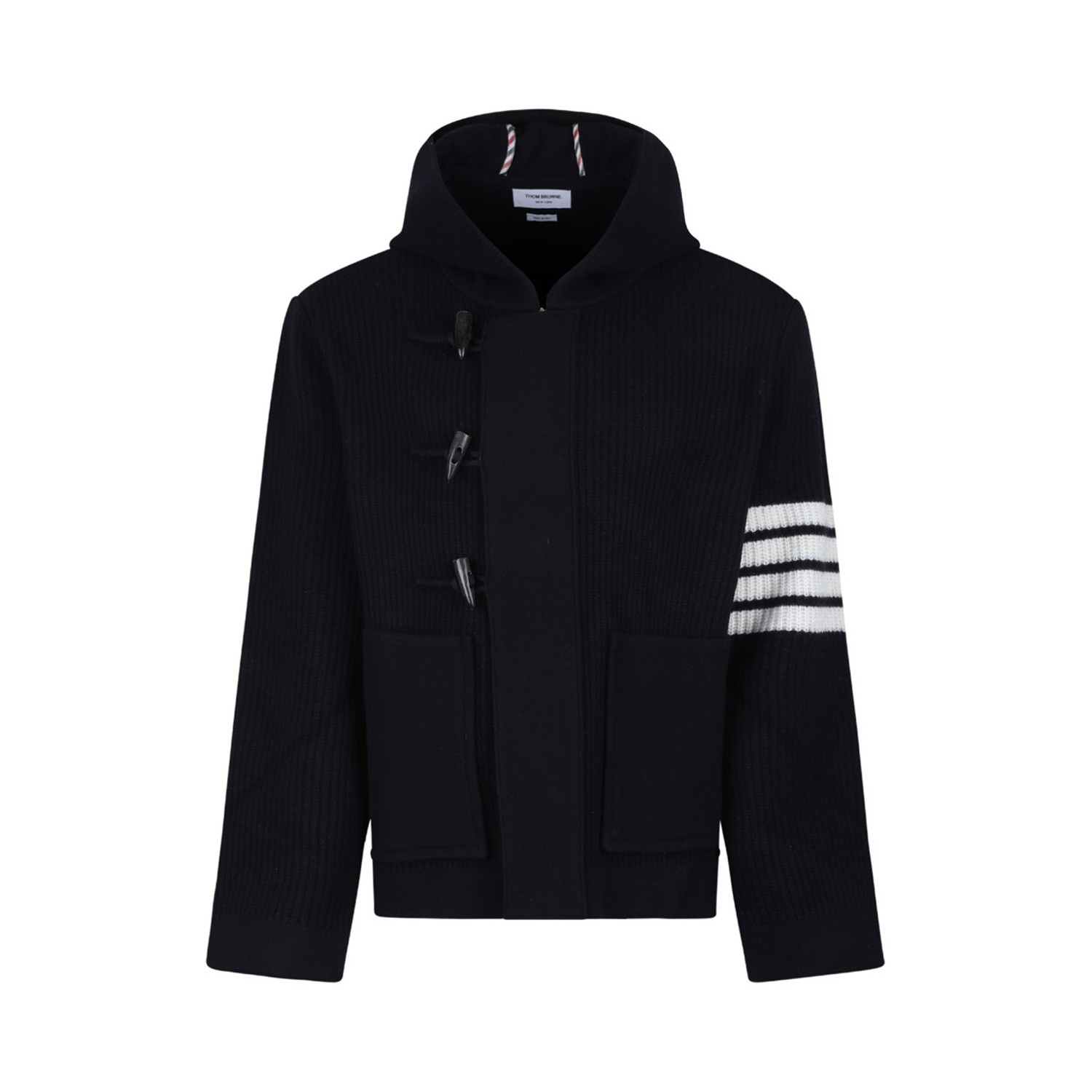 Thom Browne Navy Blue Hooded Jacket. Navy blue virgin wool jacket, side stripe detailing, ribbed detailing, off-centre front fastening, front zip fastening. Classic hood, long sleeves, straight hem.