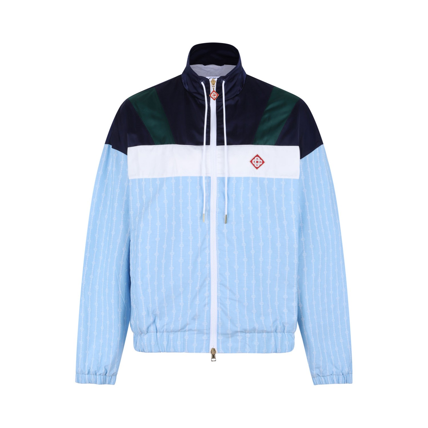 Casablanca Light Blue Track Jacket. Light blue pinstripe pattern track jacket with front zip fastening, two side welt pockets, elasticated cuffs, elasticated hem.