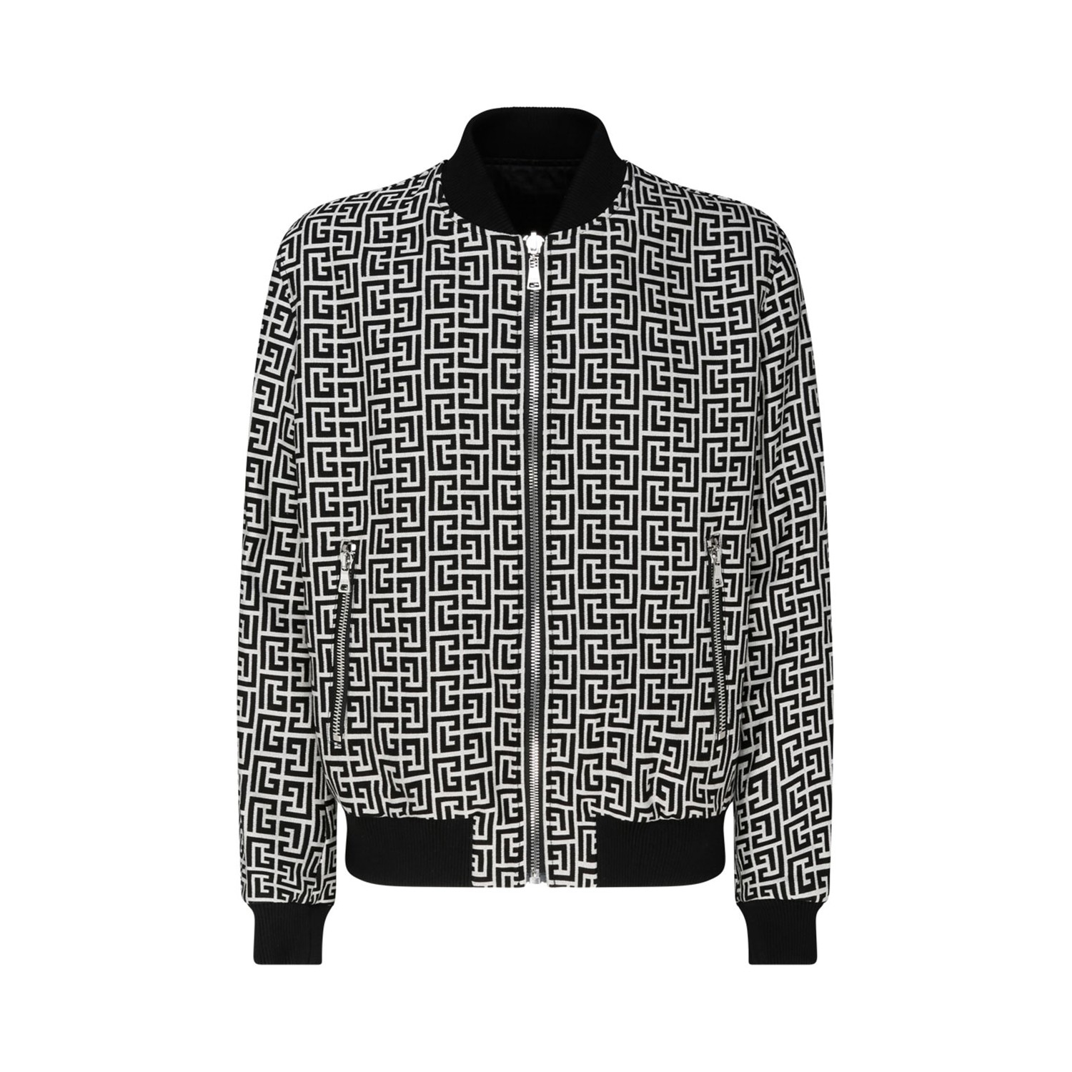 Balmain Black and White Cotton Monogram Pattern Reversible Bomber Jacket. Black and white cotton bomber jacket, debossed monogram pattern, front zip fastening, two side zip fastening pockets, ribbed band collar, long sleeve, ribbed cuffs and hem, reversib