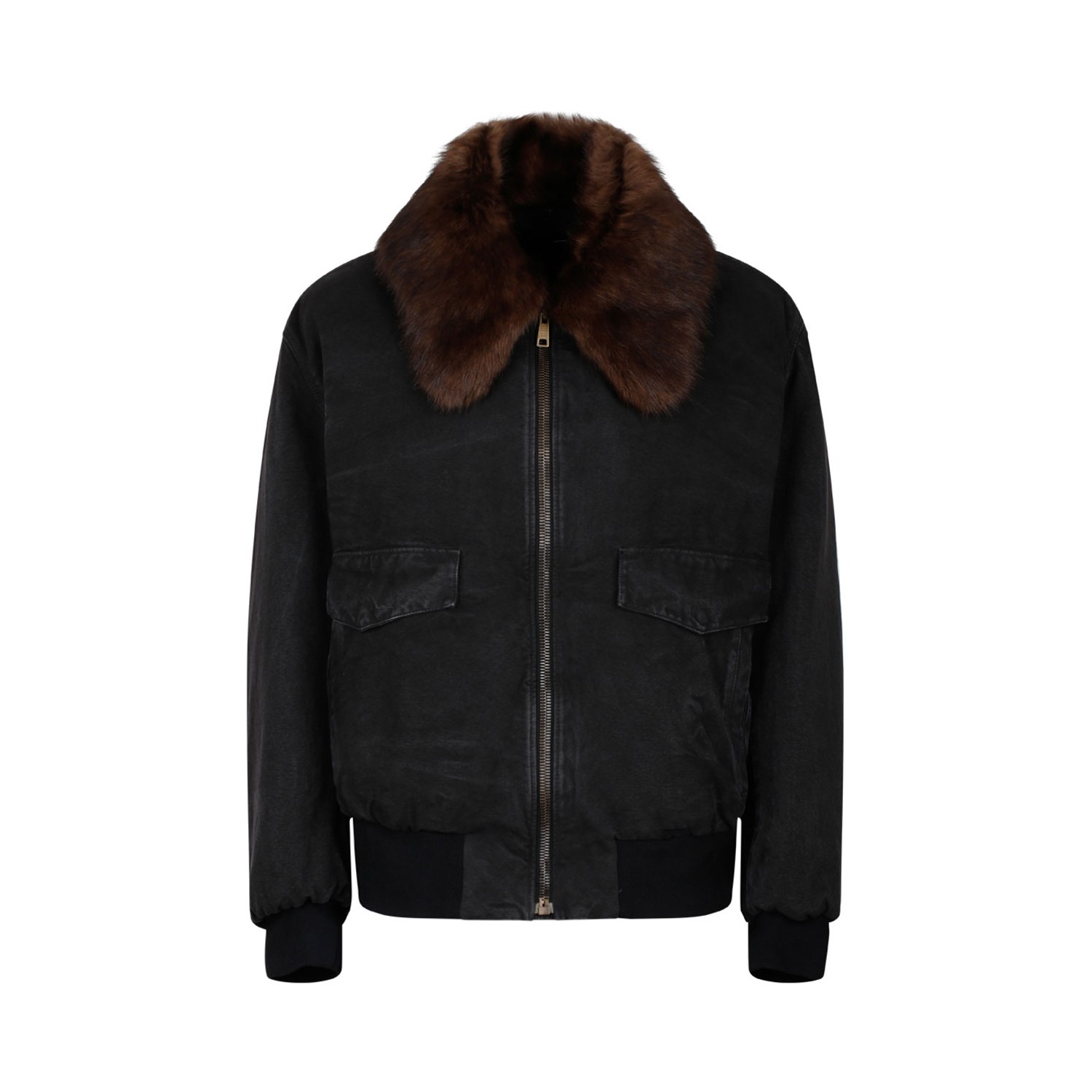 Prada Black Jacket. Black shearling and cotton jacket. Shearling collar, front zip closure, garment dyed, removable collar, front pockets with flap, long sleeves, ribbed hem and cuffs.
