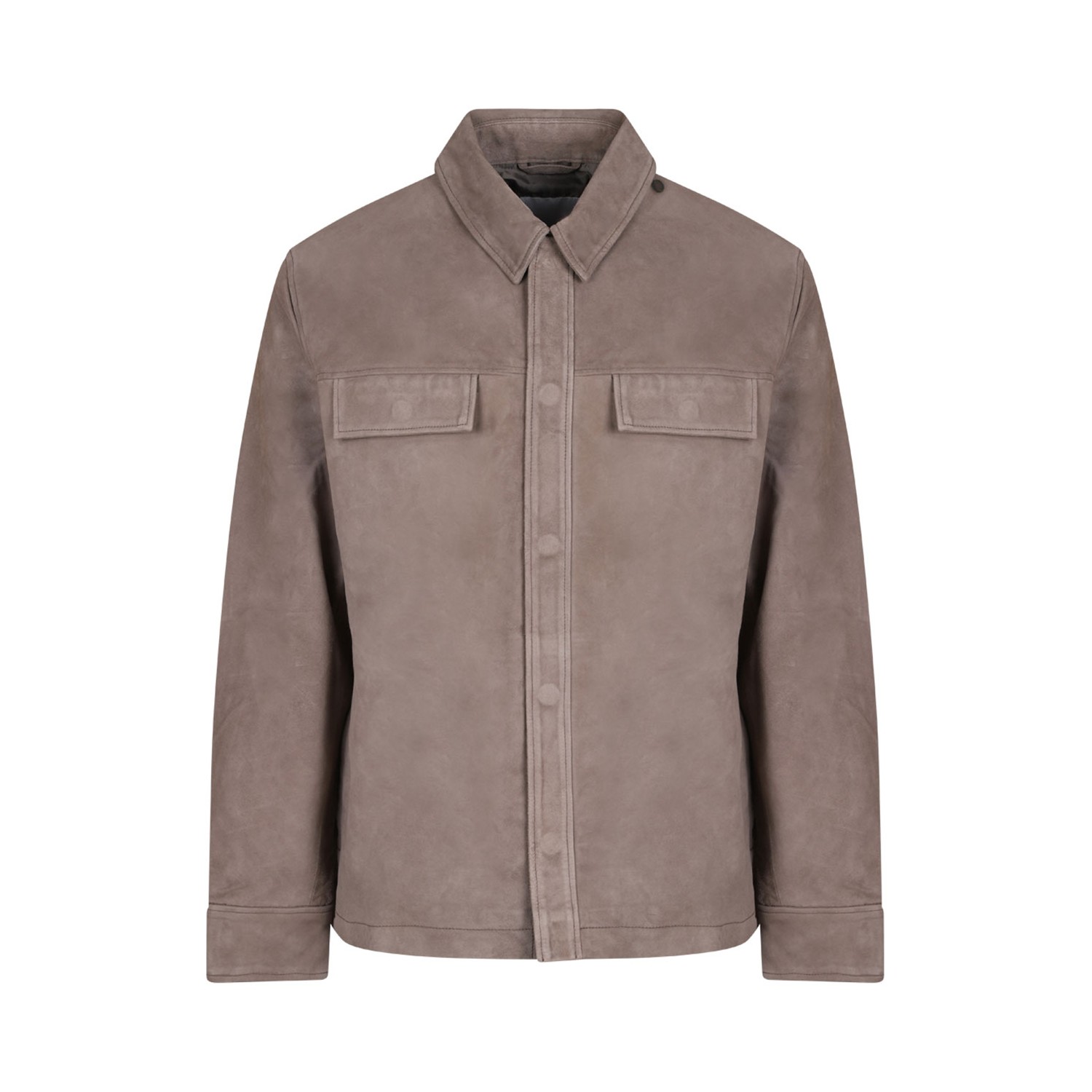 Calvin Klein Taupe Flap Pocket Suede Jacket. Taupe suede jacket with button fastening, collared neck, long sleeves and flap pockets.