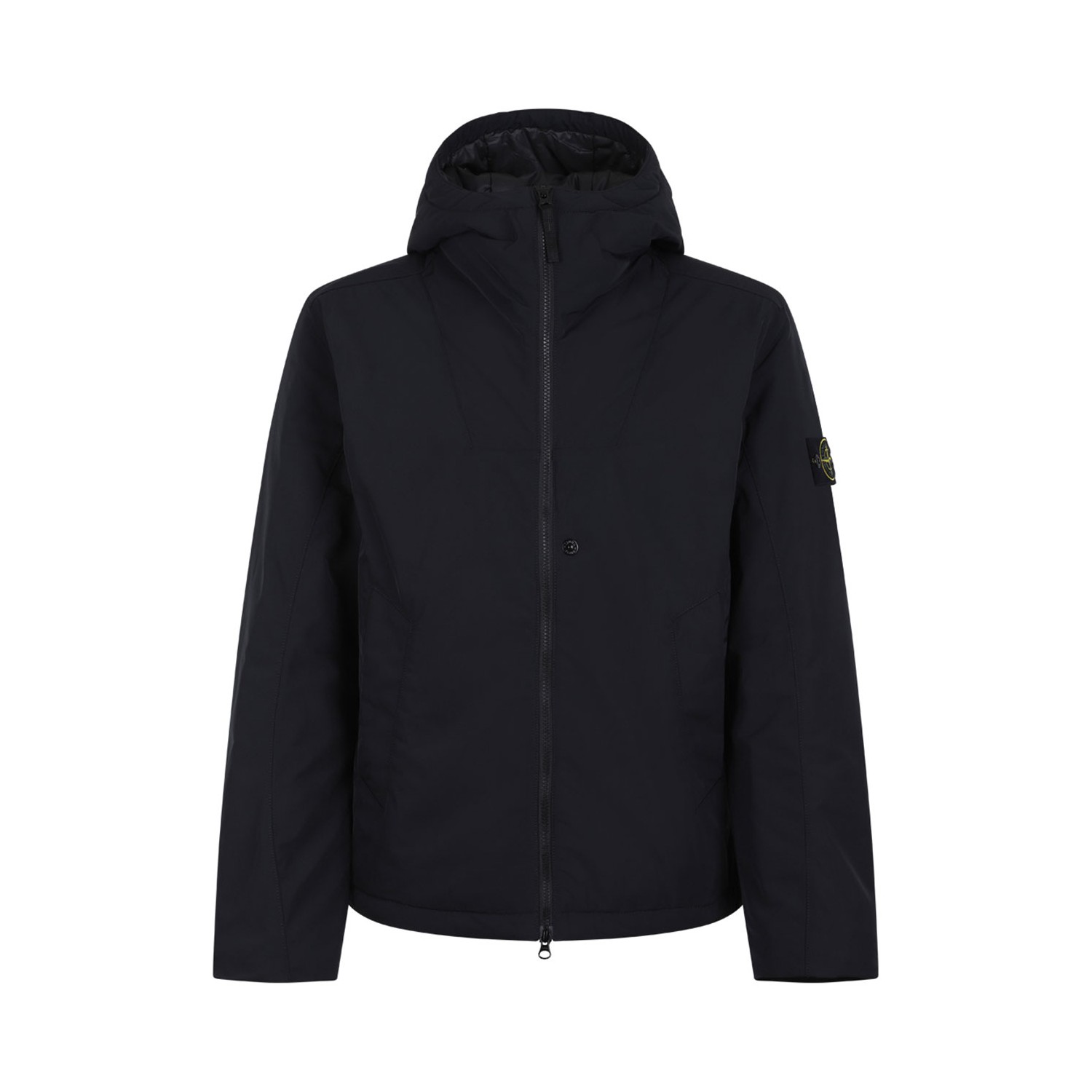 Stone Island Black Padded Hooded Jacket. Black classic hood jacket with zip fastening, long sleeves and two welt pockets.