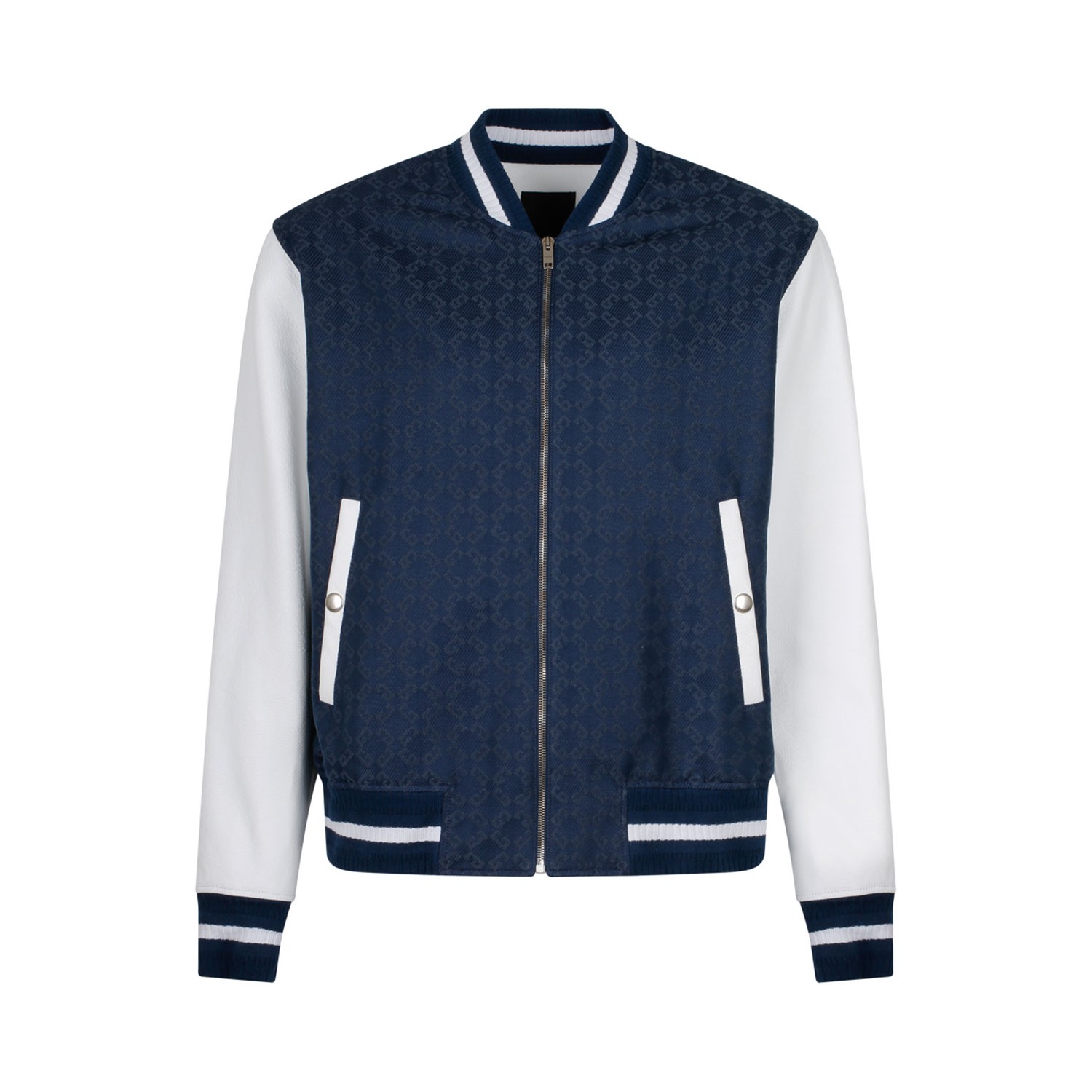 Givenchy Blue And White Varsity Jacket. Blue and white cotton and polyester jacket. Monogram 72 denim varsity jacket, full grain leather sleeves. Logo leather application sewn high on the back, ribbed stretch knit collar, cuffs and hem with contrasting stripes. Snap button closure, two side pockets with contrasting profiles, classic cut.
