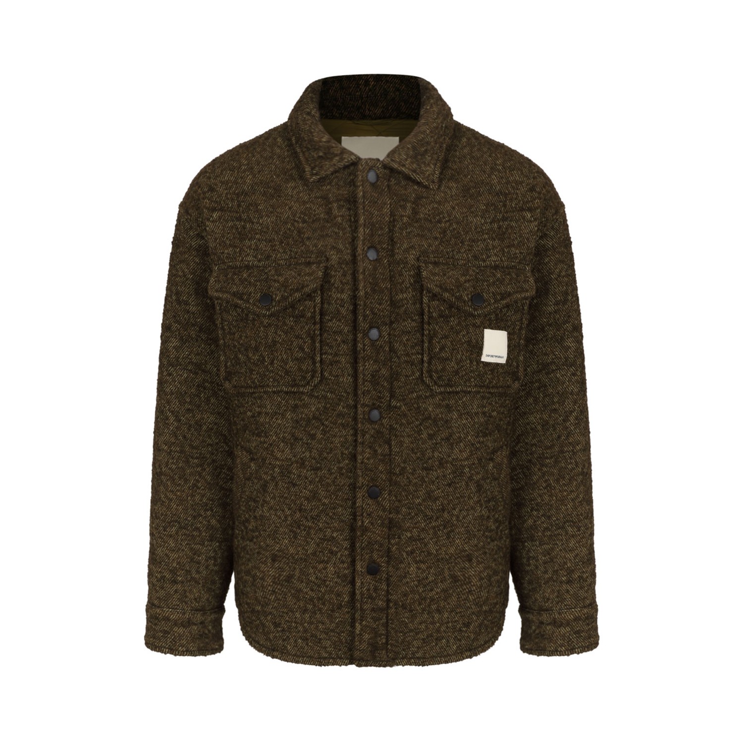 Emporio Armani Blouson Boucle Jacket. Boucle wool blend jacket with classic collar, snap fastening, patch pockets with flap and snap on the chest. Logo patch, side pockets with snap, long sleeves, snap cuffs, quilted nylon interior with diamond pattern.