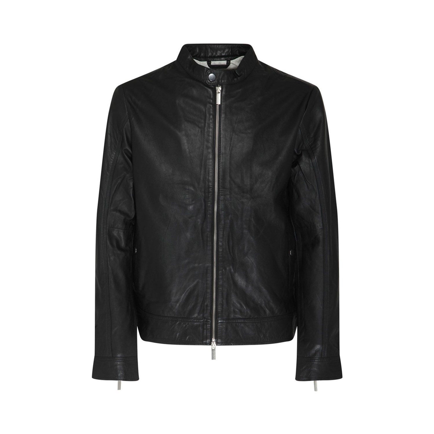 Selected Black Lamb Leather Classic Jacket. Black lamb leather classic jacket, banded collar with press stud closure, regular shoulders, long sleeves, zip fastening at cuffs. Two way zip up front, two side pockets with press stud closure, logo lining.