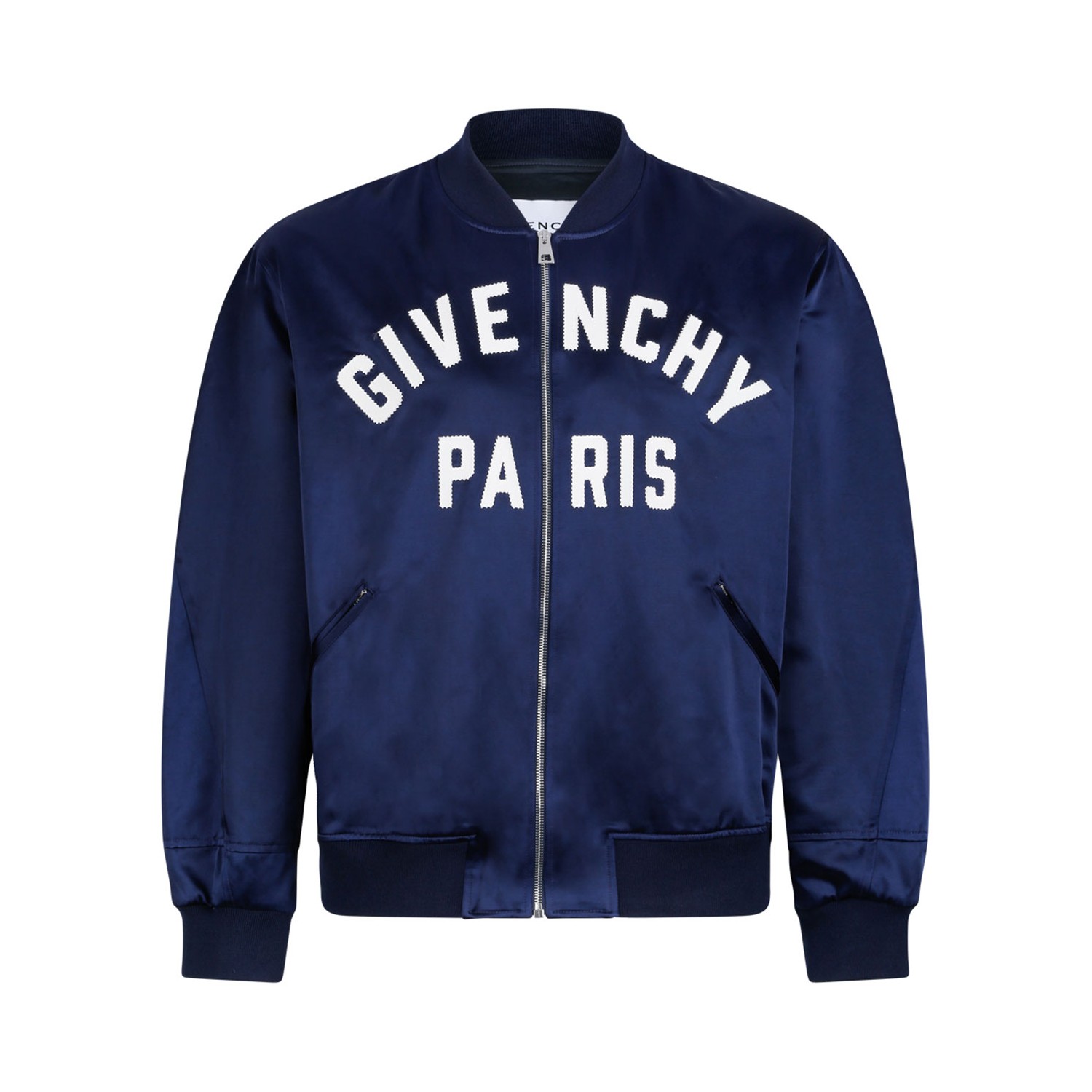 Givenchy Navy Blue Zipped Blouson Satin Bomber Jacket. Navy blue blouson in cotton satin with Givenchy Paris gros grain patch with zigzag stitchings embroidered on the front. Zipped closure, two zipped pockets, ribbed collar, hem and and cuffs.