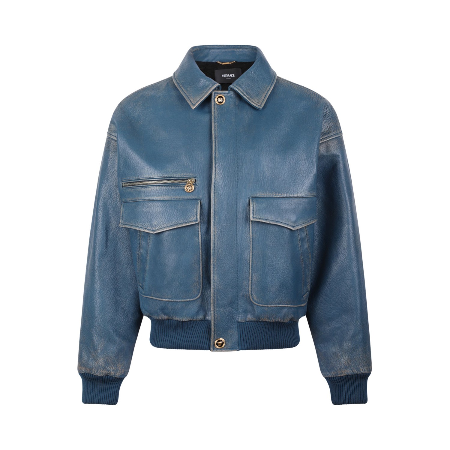 Versace Petrol Blue Leather Jacket. Petrol blue leather jacket with broad shoulders and a slightly dropped shoulder line, finished with an elastic waistband and cuffs. Embossed "VERSACE" inscription on the back remains the signature of this prestigious brand.