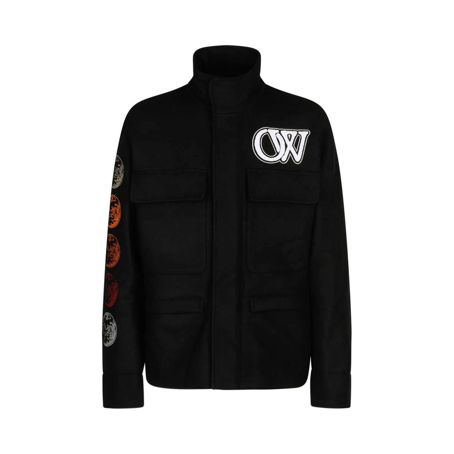 Off White Black Phase Varsity Jacket. Black virgin wool blend jacket, high neck, embroidered logo at the chest, graphic print to the rear, graphic print sleeves. Concealed front fastening, chest flap pockets, two front welt pockets, long sleeves and straight hem.