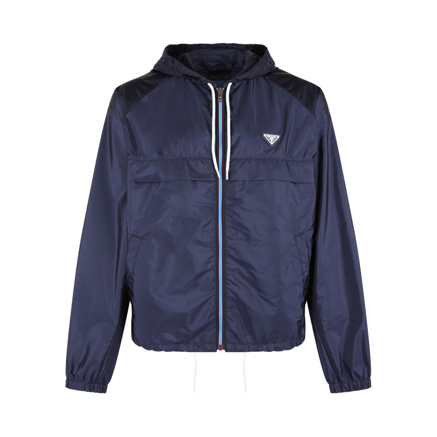 Prada Navy Blue Re-Nylon Jacket. Navy blue jacket with front zip fastening, two side slit pockets, enamel triangle logo and drawstring hood.