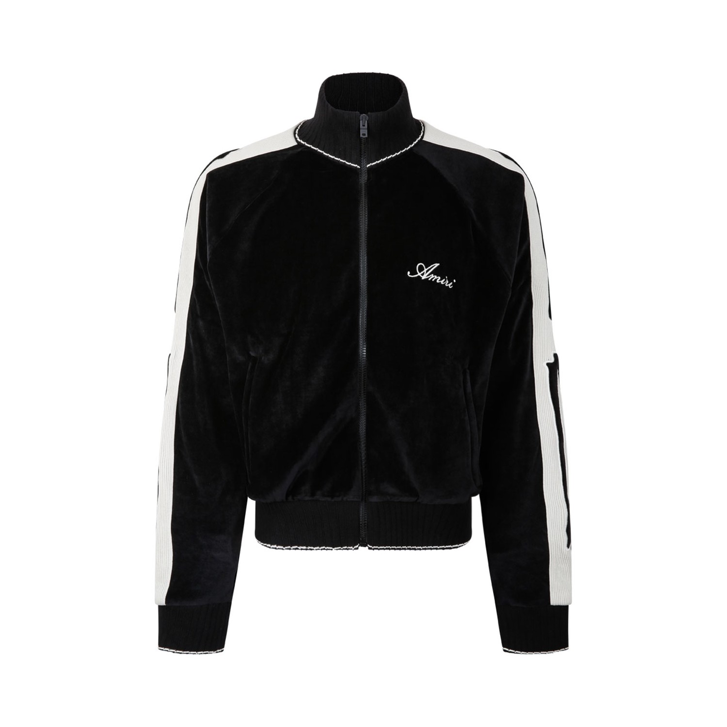 Amiri Black Bones Track Jacket. Black track jacket with illustrated bone appliques, finished with script logo embroidery, side pockets, rib knit detailing and zip closure.