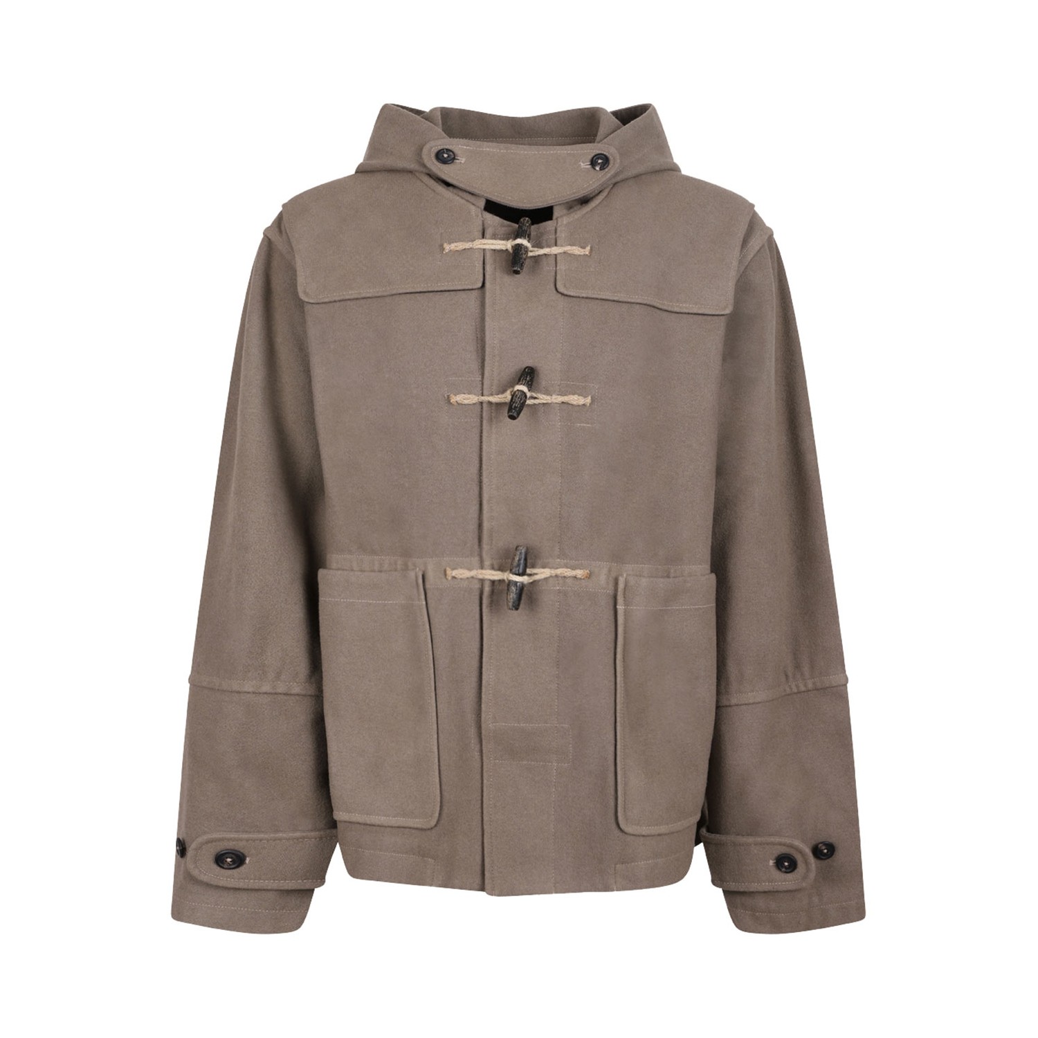 Our Legacy Light Brown Cropped Duffel Jacket. Light brown wool blend jacket with garment dyed, front toggle fastening, classic hood. Storm flap, two front patch pockets, long sleeves. Buttoned cuffs, straight hem and partial lining.