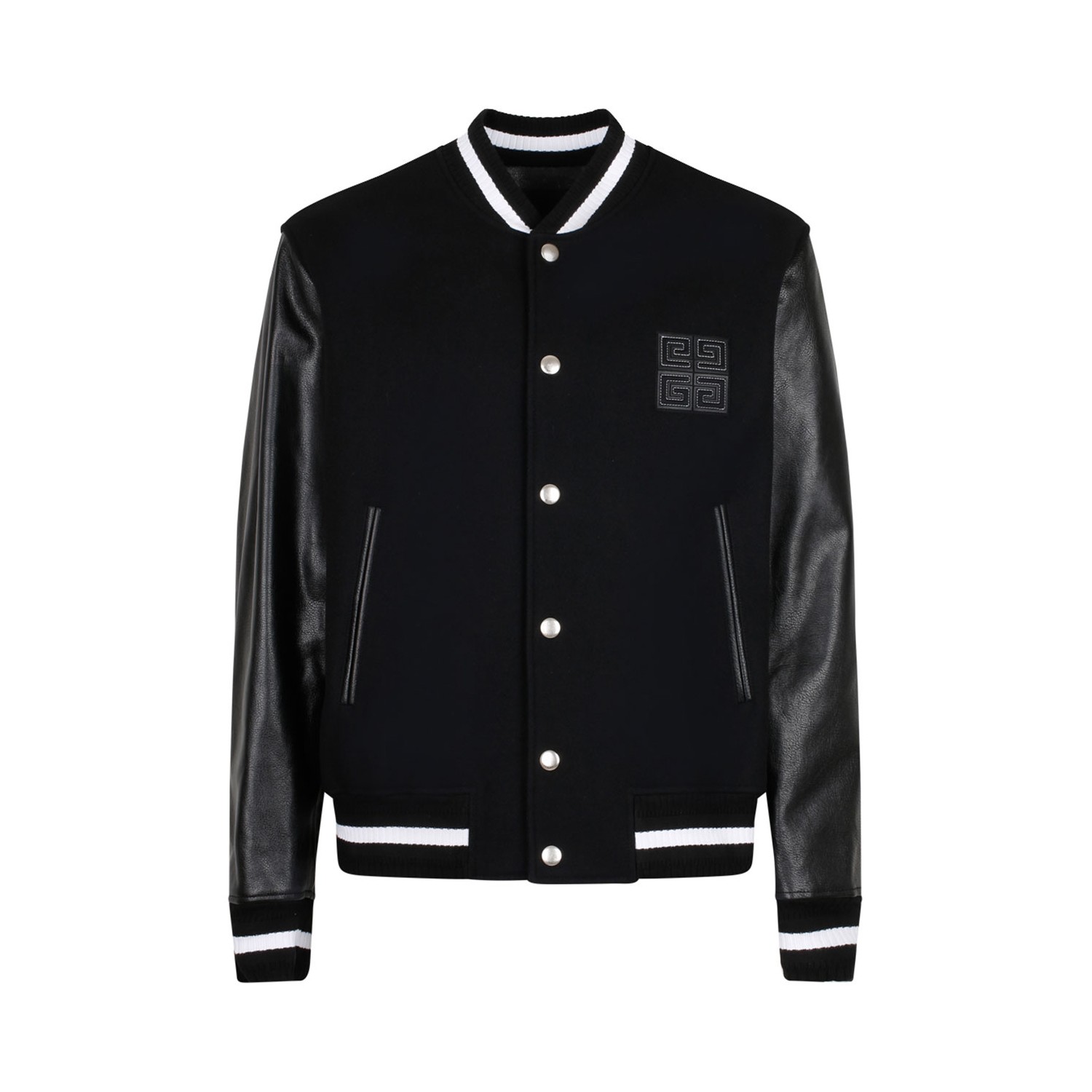Givenchy Black Varsity Jacket. Black wool and polyamide jacket. Full grain leather sleeves, 4G application in brushed fabric with contrasting stitching in relief on the chest, ribbed stretch knit collar, cuffs and hem with contrasting stripes. Snap button closure, two side pockets, classic cut.
