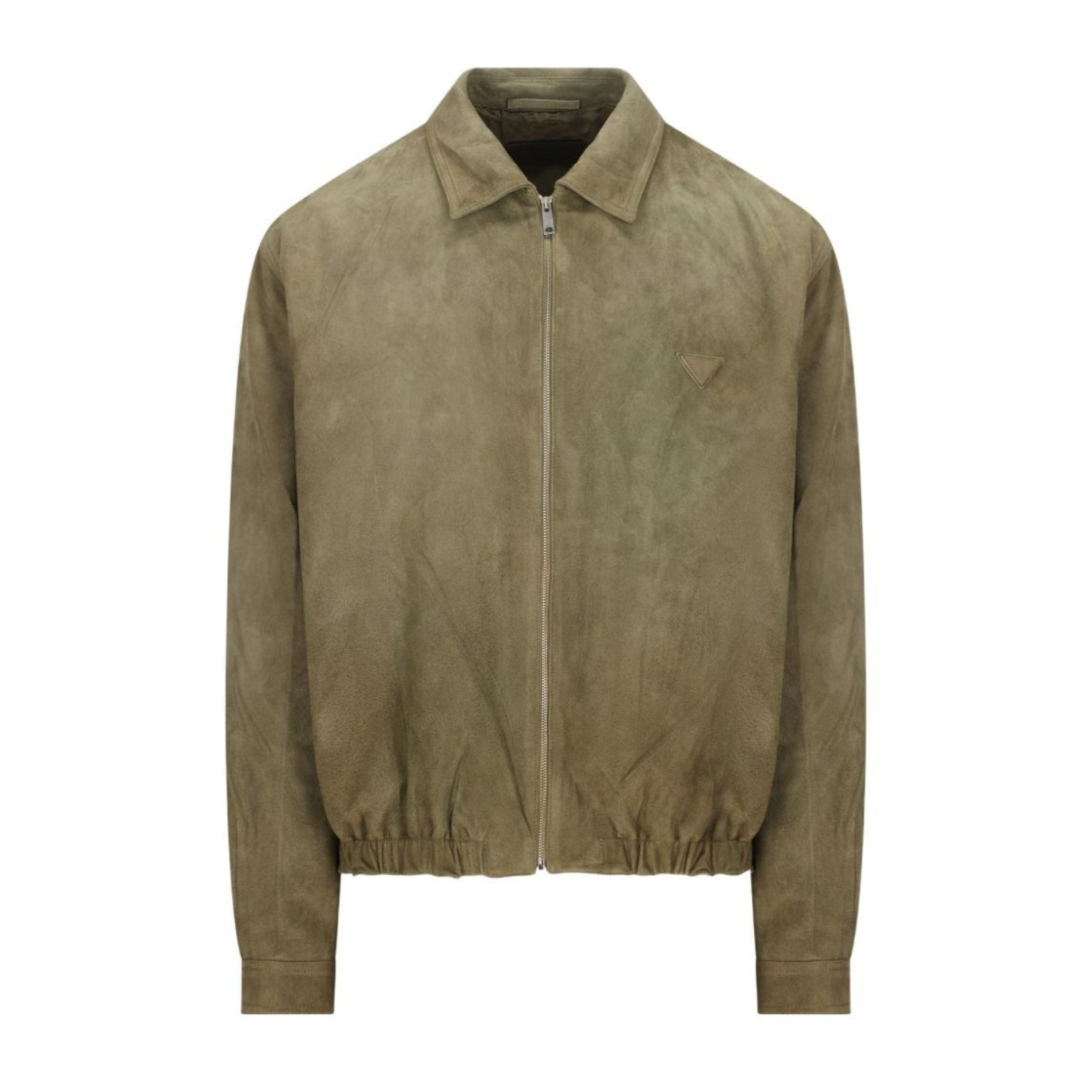 Prada Green Suede Zip Jacket. Green zip-up jacket with a refined, contemporary silhouette. Jacket crafted in soft premium suede for a luxurious, velvety finish. Featuring a classic pointed collar, front zip closure, long sleeves with buttoned cuffs, elasticated hem, side welt pockets and signature Prada logo detail on the chest for a sophisticated, understated look.
