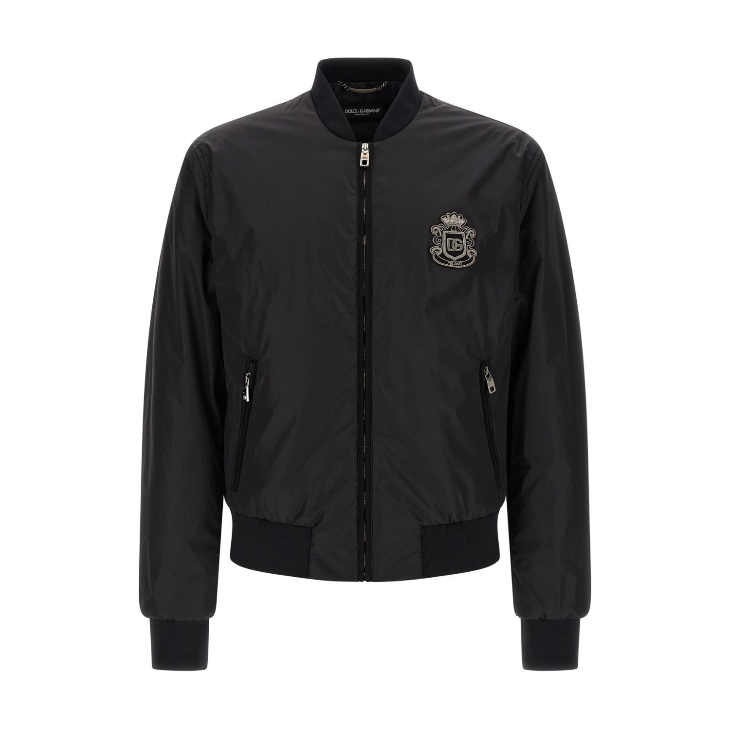 Dolce & Gabbana Black Bomber Jacket With DG Patch. Black lightly padded bomber jacket crafted in technical fabric. Featuring front zip closure, ribbed knit collar, cuffs and hem, and side zip pockets. Detailed with iconic ‘DG’ crest patch on the chest for a bold signature finish. Contemporary fit, combining sporty attitude with refined Italian craftsmanship.