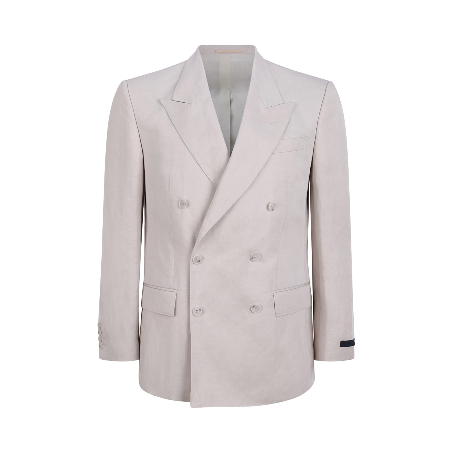 Boss x David Beckham Open Grey Double-Breasted Blazer. Open grey double-breasted blazer from the exclusive Boss x David Beckham collection, featuring a sharp, modern silhouette. Crafted in premium structured fabric with a refined finish, it showcases a six-button closure, wide peak lapels, chest welt pocket and front flap pockets. Finished with buttoned cuffs and full lining for comfort and structure. A sophisticated statement piece for elevated formal and business looks.