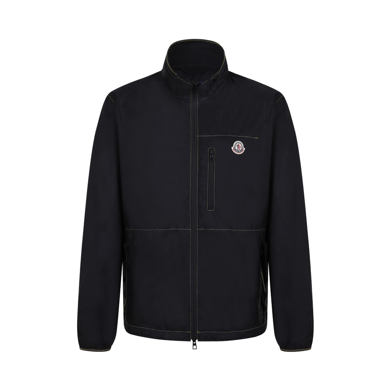 Moncler Arrakis Black Technical Jacket. Black Arrakis jacket crafted in lightweight technical fabric, defined by a clean and contemporary silhouette. This Moncler zip-up jacket features a high collar and removable hood for versatile protection, enhanced by contrast stitching details that highlight its modern design. Designed with a front zip closure, vertical chest zip pocket and two side zip pockets for functionality and everyday practicality. Finished with the iconic Moncler logo patch on the chest and elasticated cuffs for comfort. A refined outerwear essential, perfect for transitional seasons and elevated casual styling.