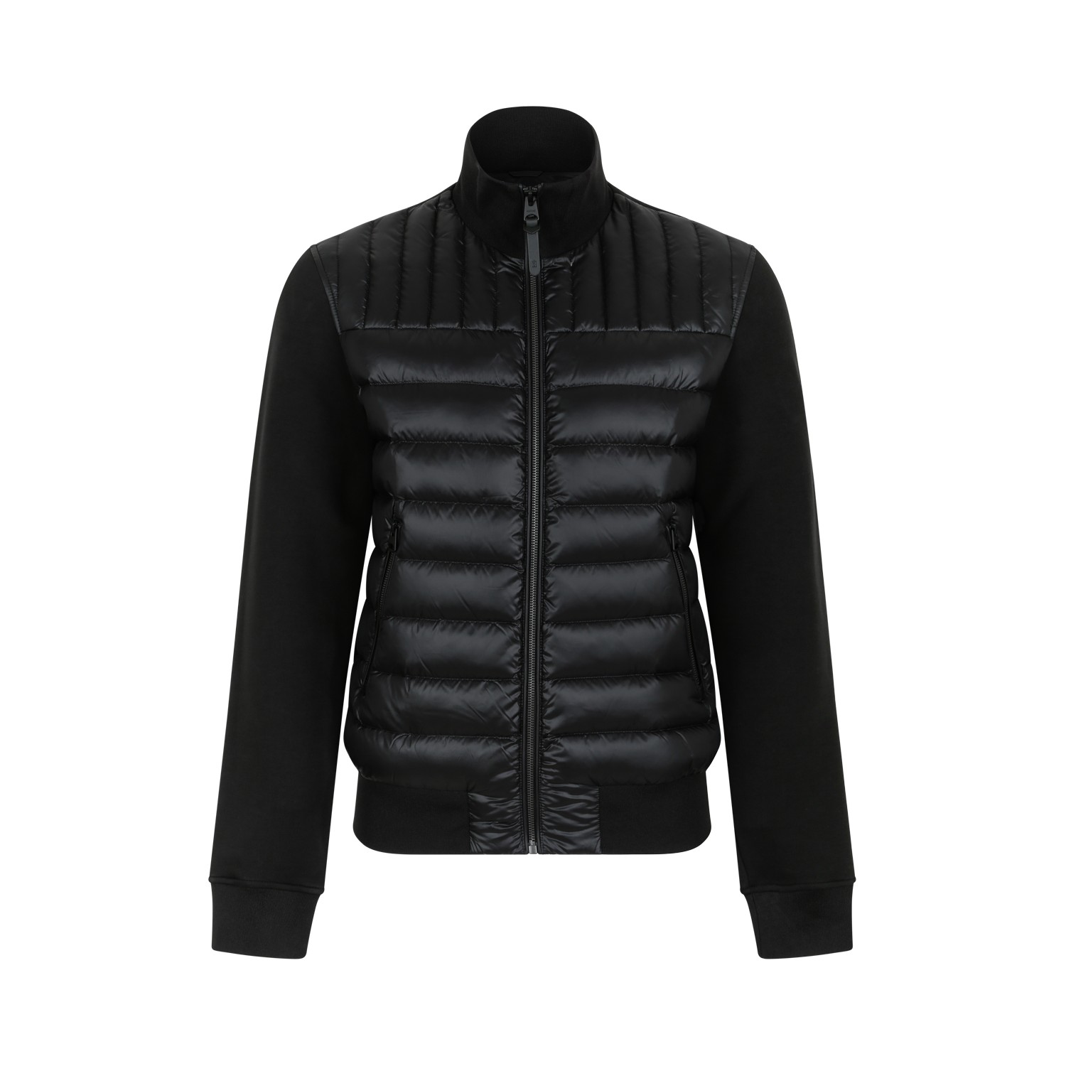 Mackage Black Hybrid Down Jacket. Modern black jacket defined by a sleek, performance-inspired silhouette. Crafted from a combination of lightweight quilted down-filled panels and smooth technical fabric sleeves, this Mackage jacket offers optimal warmth while maintaining flexibility and comfort. The design features a high stand collar and full front zip fastening that enhance protection against the elements. Horizontal quilting adds structure and visual depth, while the streamlined fit reflects the brand