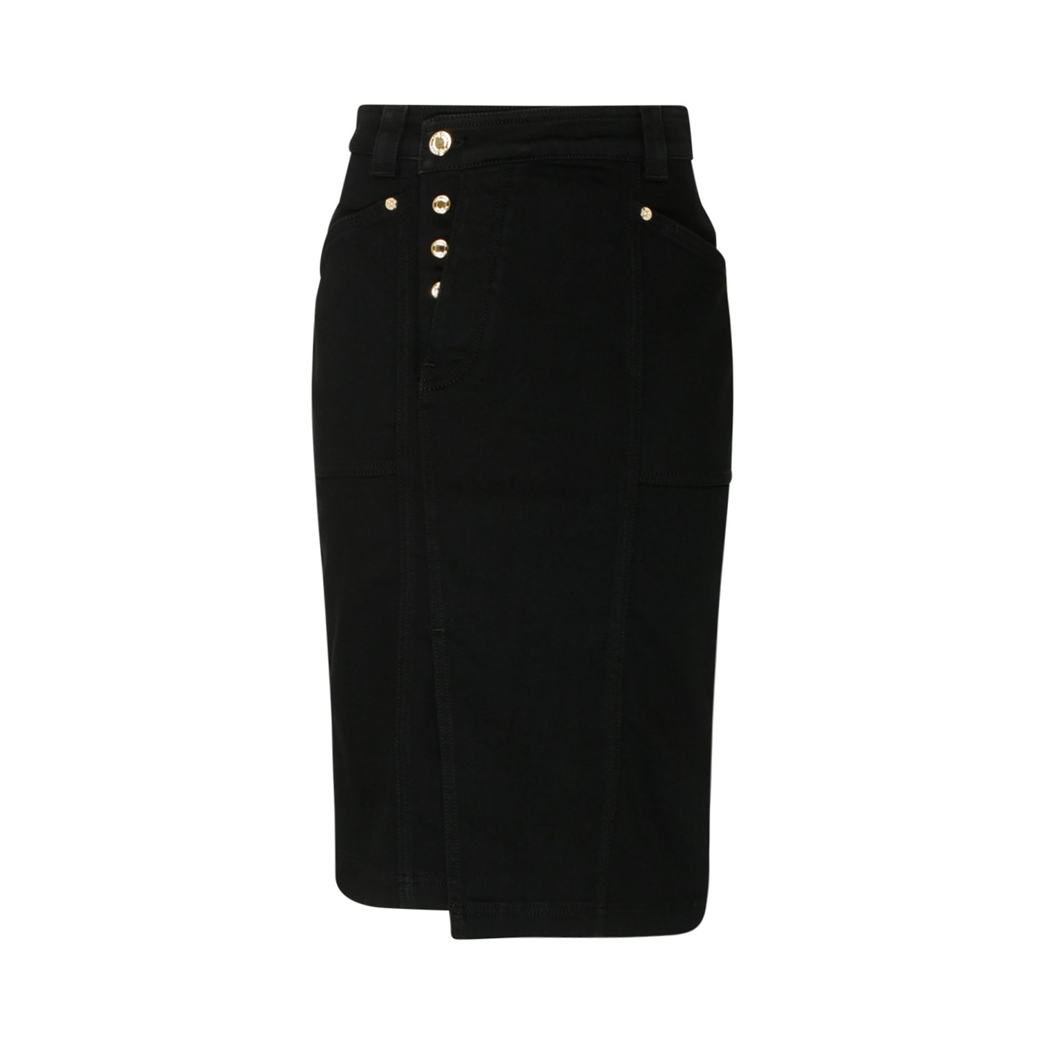 Tom Ford Black Cotton Blend Asymmetric Pencil Skirt. Black cotton blend pencil skirt, asymmetric front button fastening, asymmetric design, belt loops, embossed gold tone button, pencil silhouette.