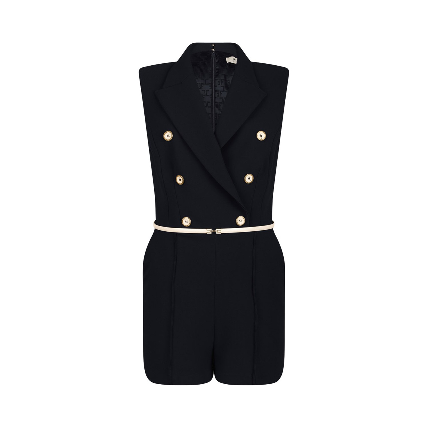 Elisabetta Franchi Black Double Breasted Jumpsuit. Black sleeveless jumpsuit in stretch crepe with contrasting piping. Double-breasted, peak lapels and shorts with pockets on the front and flaps on the back. The belt is embellished with the clamp with enamel logo, the buttons have a gold metal ring. Slim fit.