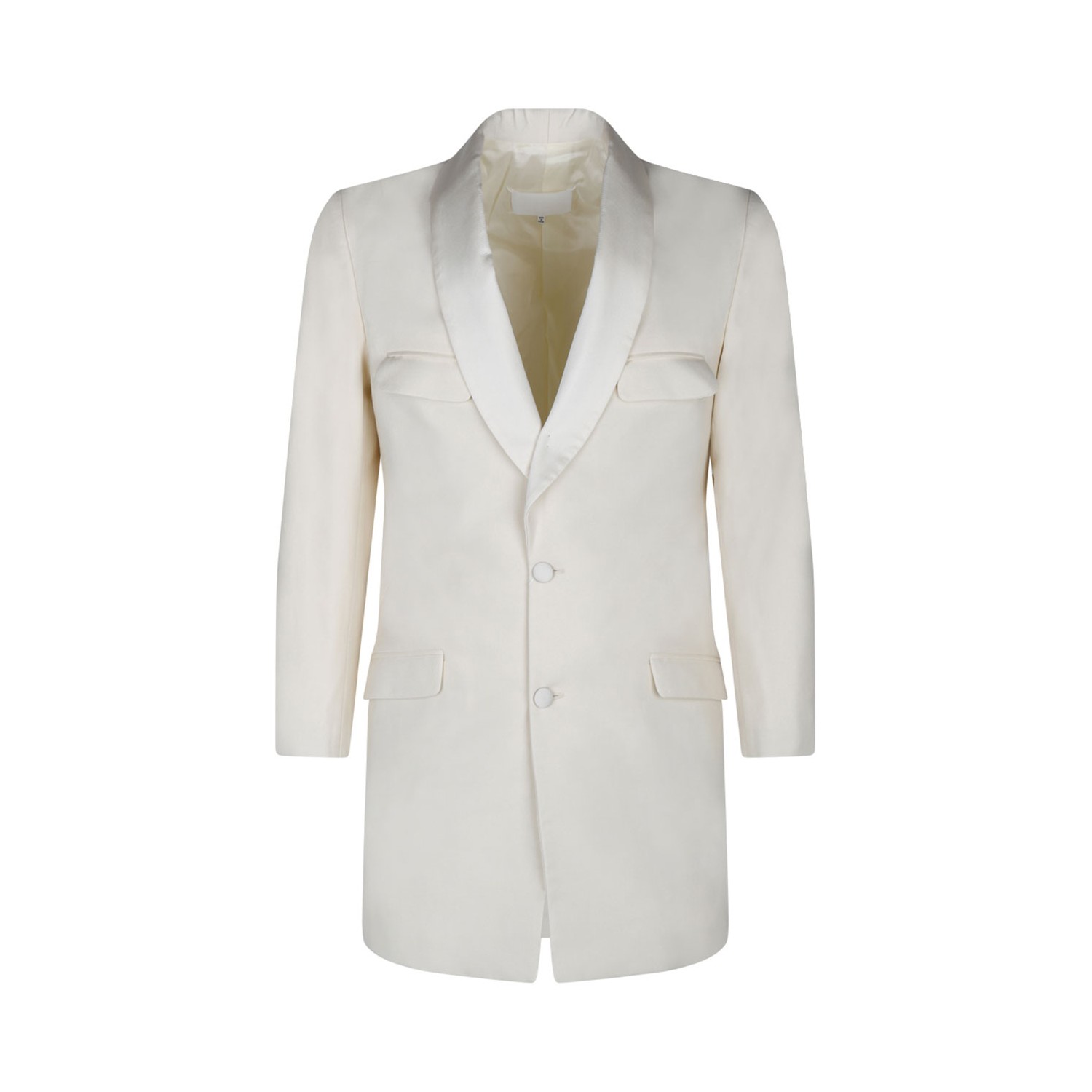 Maison Margiela Cream White Wool-Silk Blazer. Cream white wool - silk blazer, front button fastening, single breasted, four front flap pockets, shawl lapels, English rear vents, buttoned cuffs, long sleeves, straight hem, thigh length.