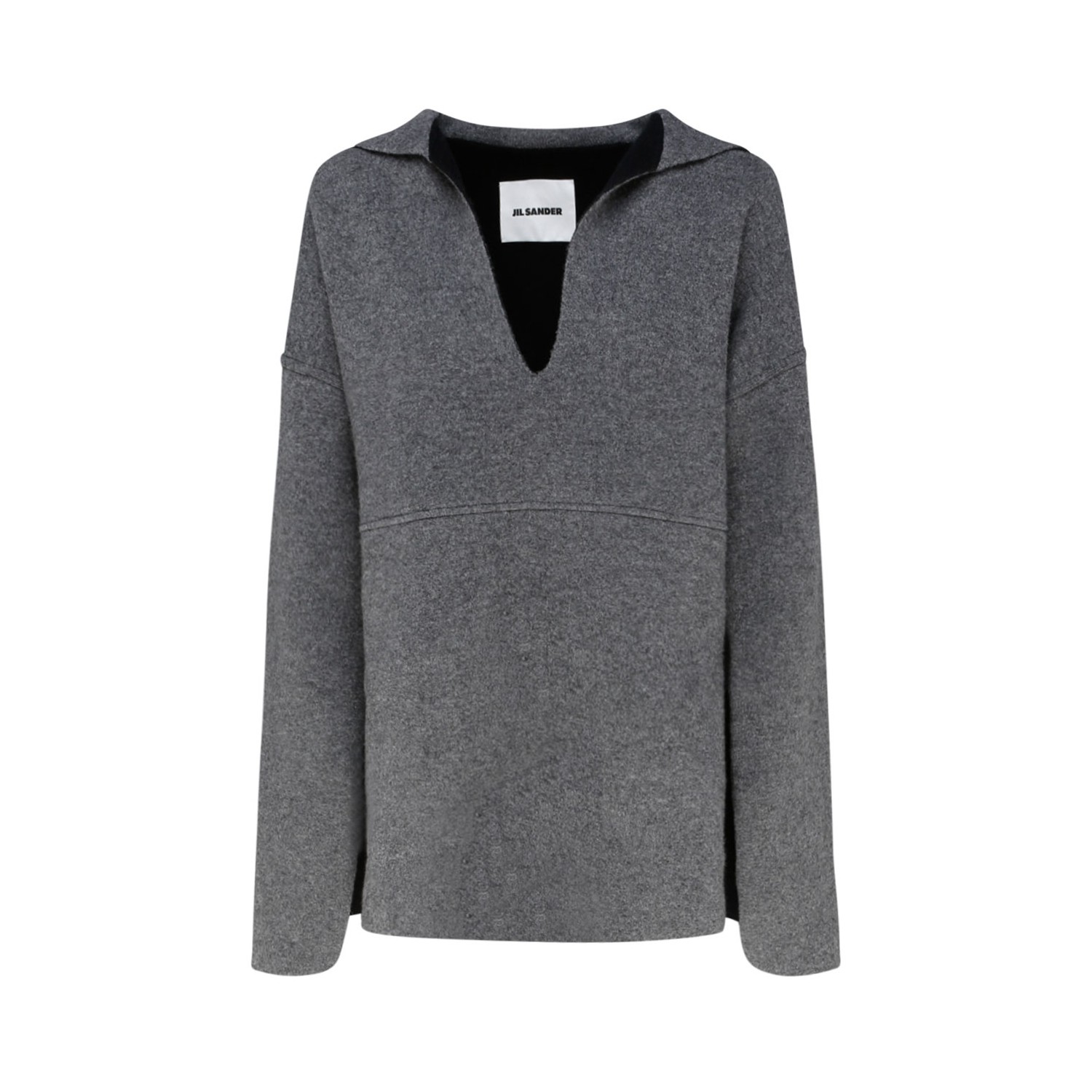 Jil Sander Grey Virgin Wool Neckline Knit Sweater. Grey virgin wool sweater, sailor neckline, long sleeves.