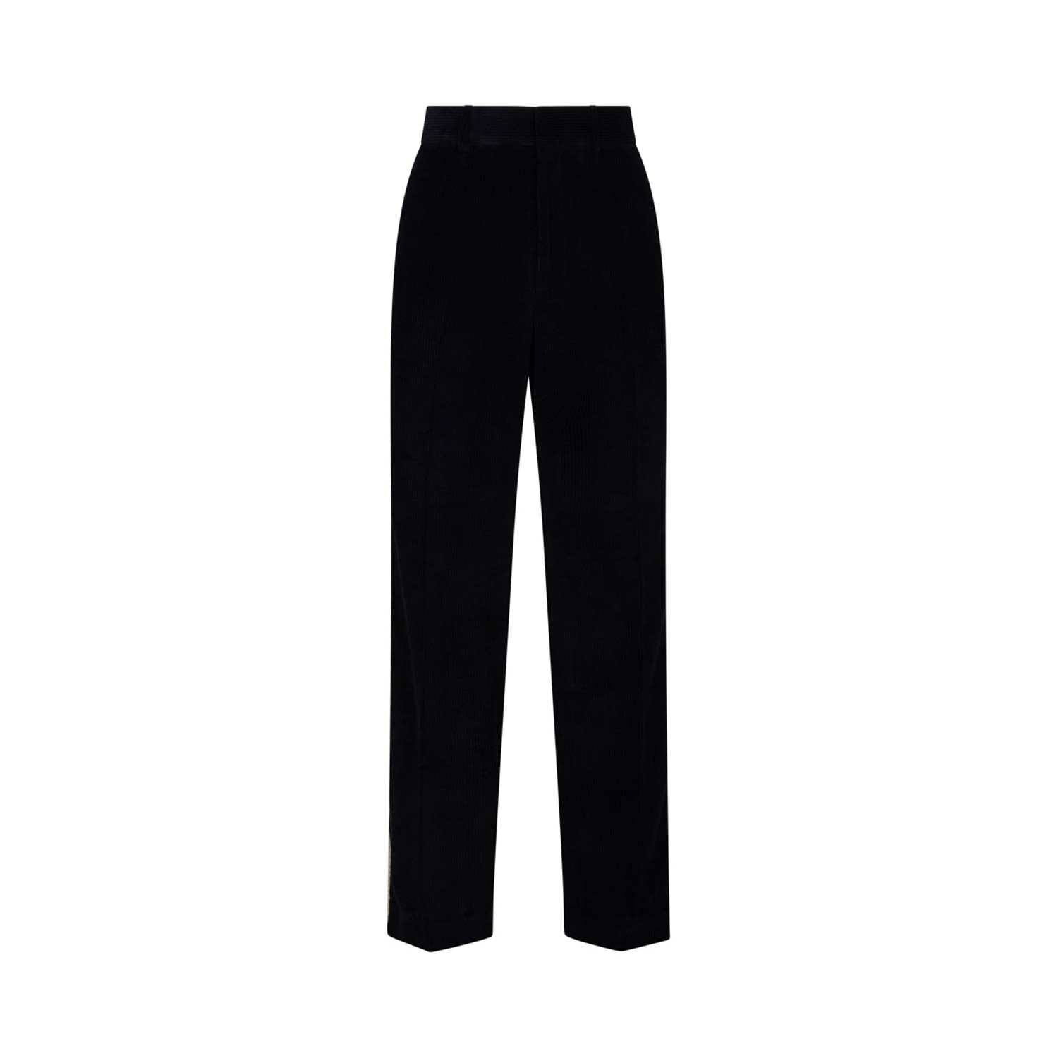 Palm Angels Black Corduroy Trousers. Black cotton trousers, concealed front fastening, belt loops, two side slit pockets, two rear flap pockets, crochet stripes, loose straight leg.