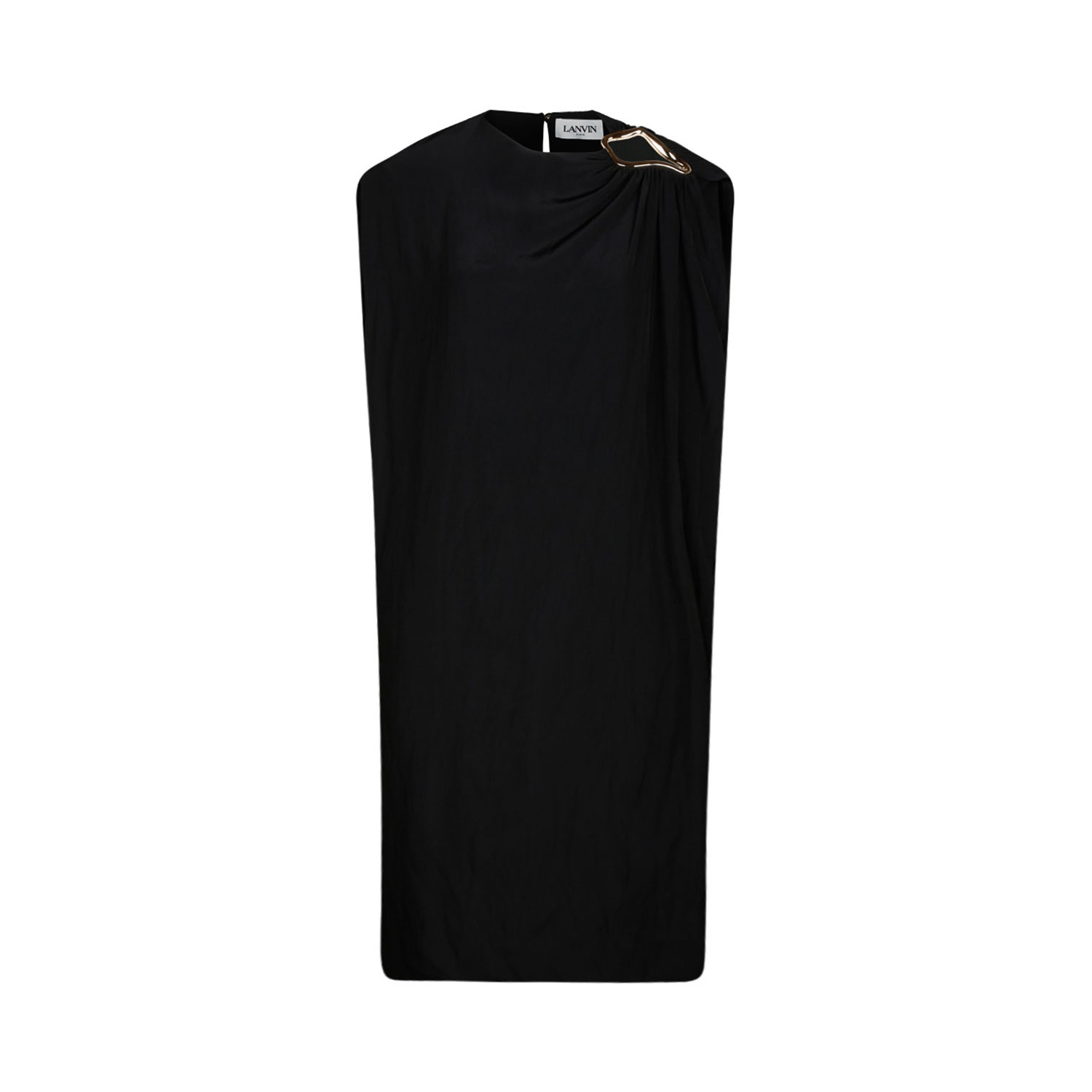 Lanvin Black Ring Detail Midi Dress. Black high shine finish midi dress, crew neck, ring embellishment, draped detailing, sleeveless, keyhole detail to the rear, straight hem, below knee length.