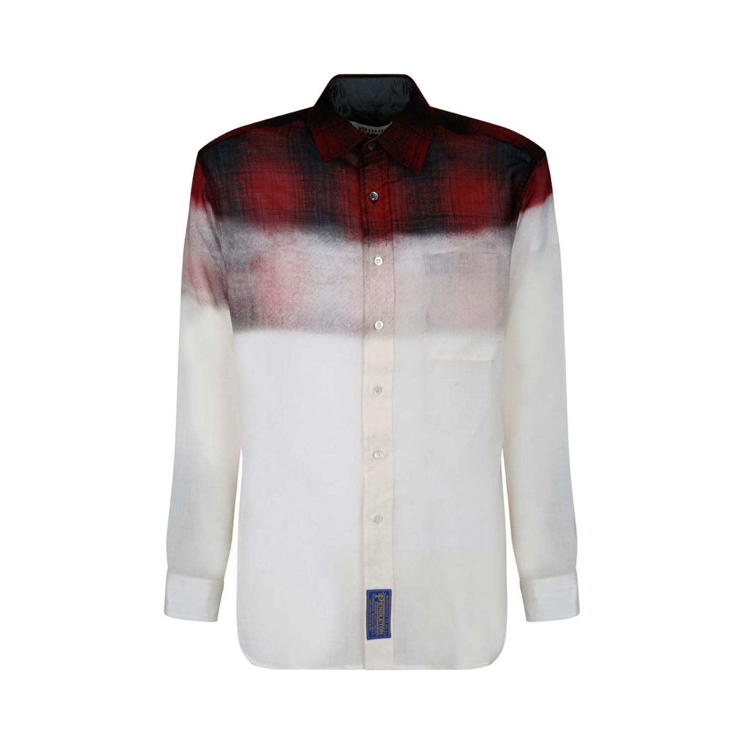 Maison Margiela Pendleton Contrast Shirt. Red and black Pendleton heritage check print shirt, mother of pearl button closure, patch pocket. Curved hem, side slits and four stitches at the back.