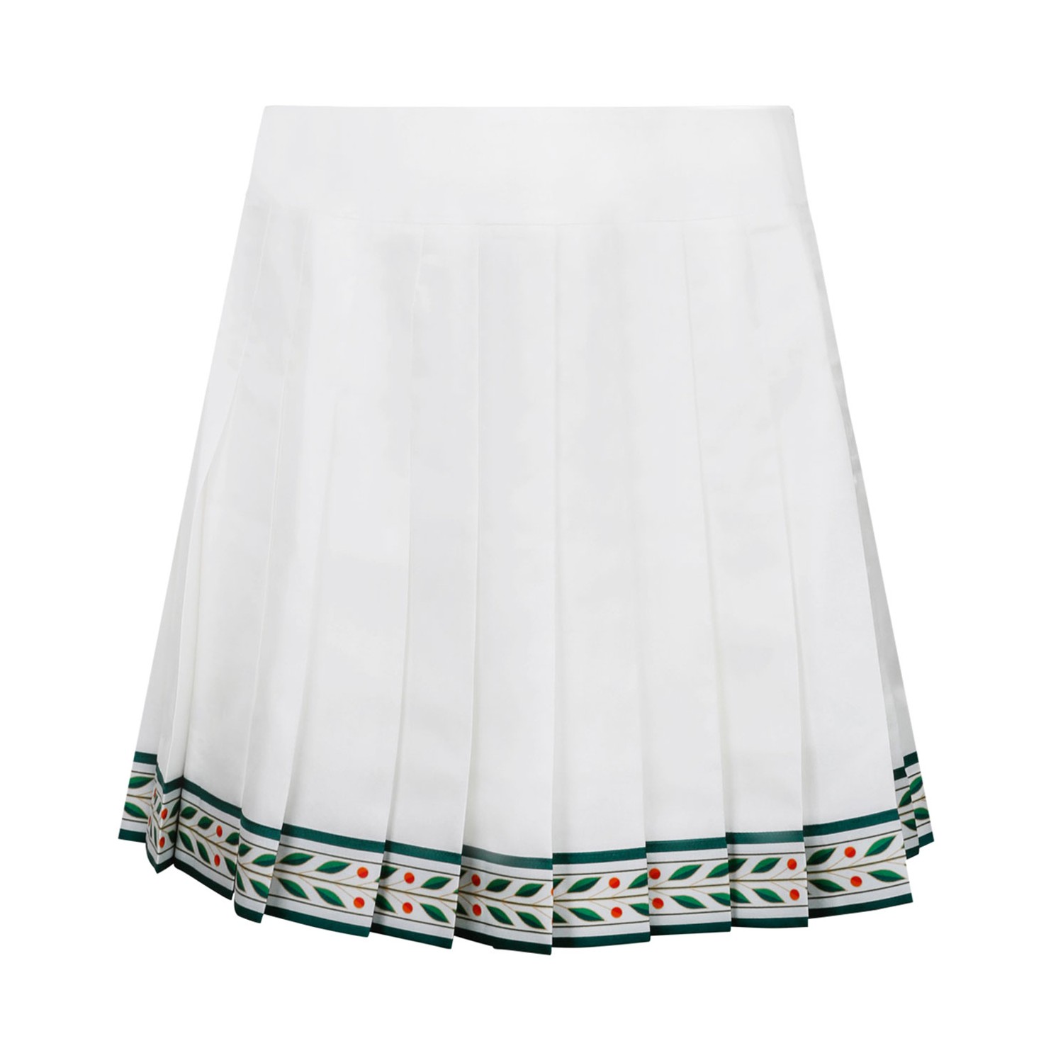 Casablanca White Laurel Tennis Skirt crafted from a silk twill fabric and lined with polyester, this piece is completed with a zip closure and a plain waistband. Coloured detail in the border.