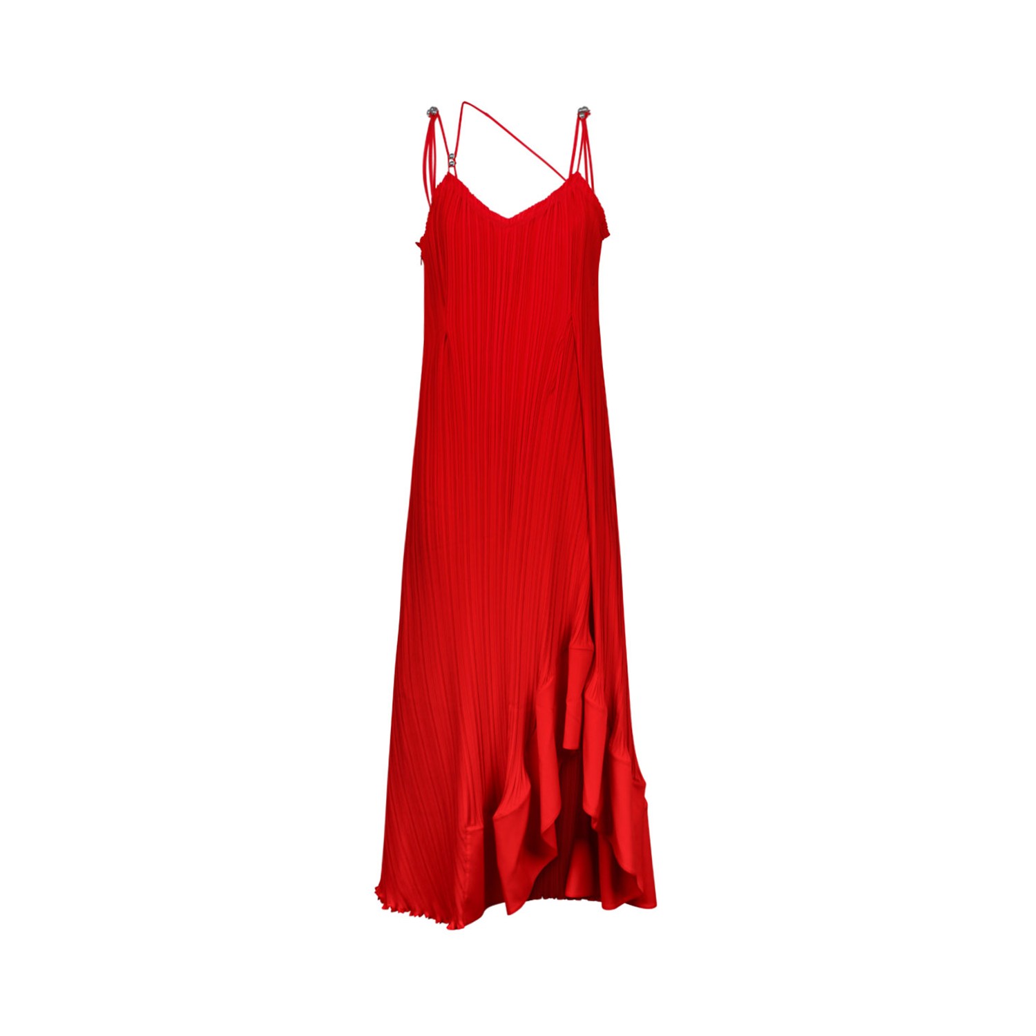 Lanvin Straps Pleated Long Red Dress made of crepe de chine, graphic straps with ball buttons. Loose and flowing fit. Pleats at the waist. Non-pleated frill at the bottom of the dress. Raw edge finishes.