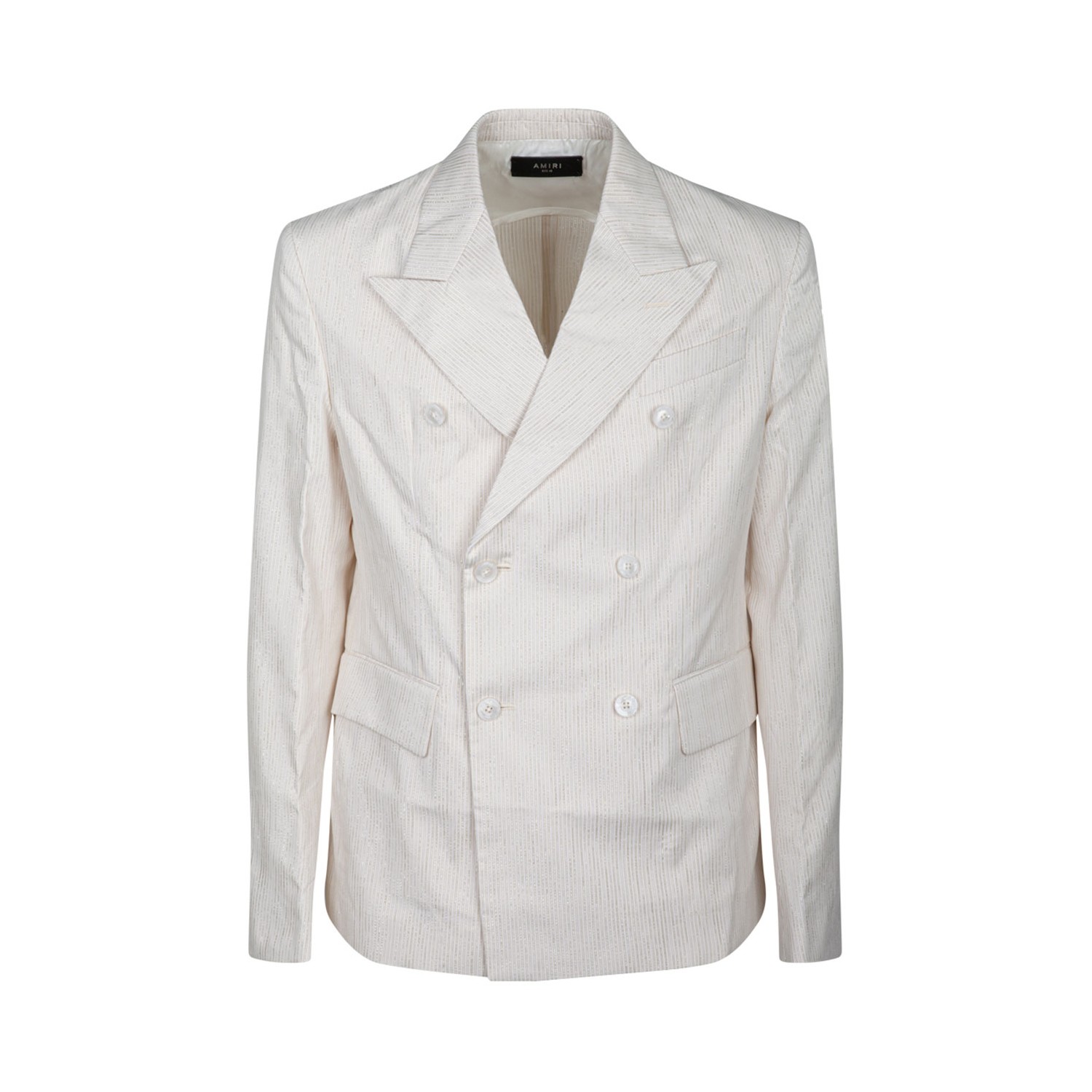 Amiri Summer Sand Blazer. Summer sand metallic threading blazer, vertical stripe pattern, peak lapels. Long sleeves, buttoned cuff sleeves, chest welt pocket. English rear vents, partial lining, double breasted button fastening.