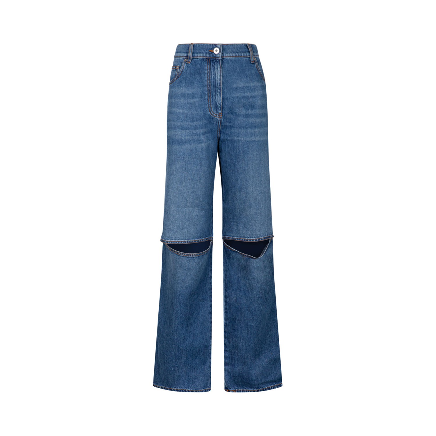 JW Anderson Cut Out Denim Jeans. Blue denim jeans, classic five pockets, cuts on the front, button and zip closure. Anchor embroidery and logo patch on the back.