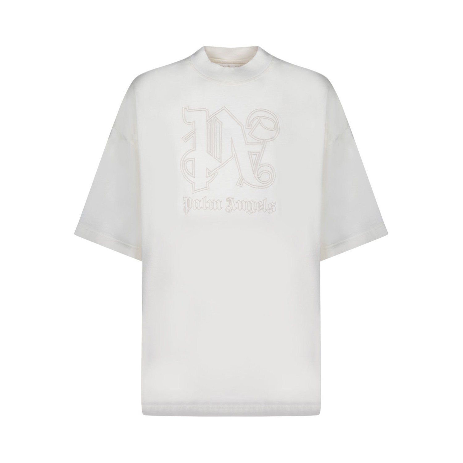 Palm Angels Monogram Statement T-Shirt. White short-sleeved t-shirt made of cotton jersey, enriched by the tone-on-tone Monogram Statement embroidery on the front. Crew neck finished in micro ribs. Slim fit.