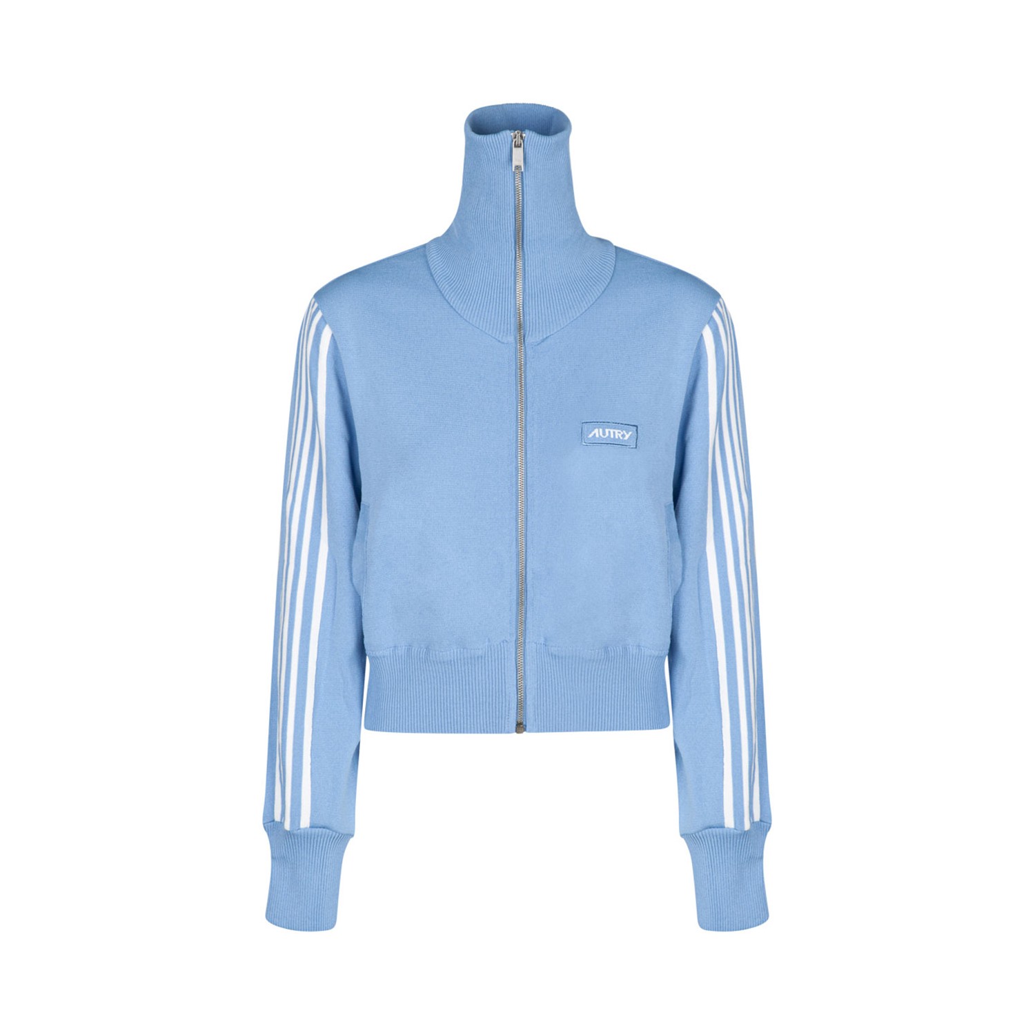 Autry Full Zip Knitted Sweatshirt. Sweatshirt made of light viscose blend knit with striped inlay on the sleeves and jacquard logo on the chest with embroidered frame. Full-zip closure. Welt pockets. Ribbed high collar, cuffs and hem. Regular fit
