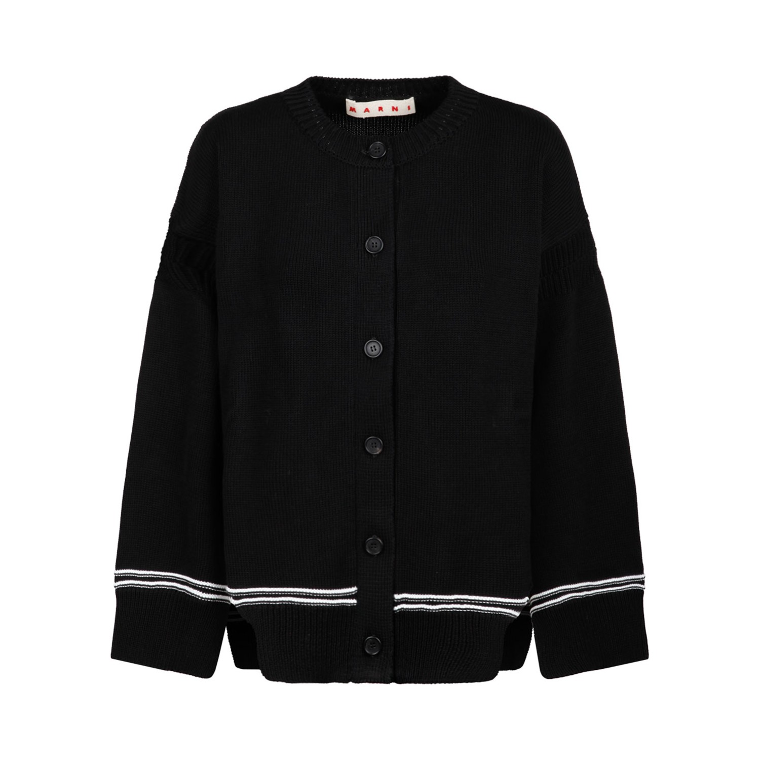 Marni Black Wool Cardigan. Black virgin wool cardigan, long kimono sleeves. Boxy fit. Intarsia logo on back. Asymmetrical length.