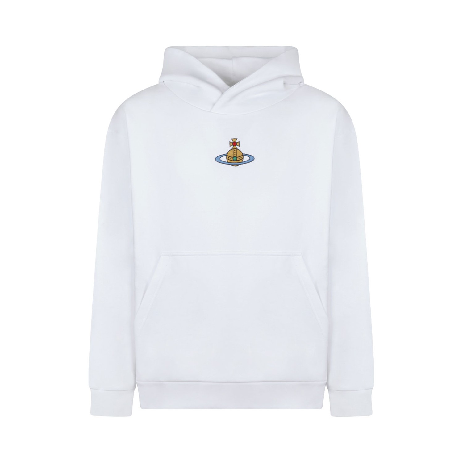 Vivienne Westwood White Logo Embroidery Hoodie. White cotton hoodie, logo embroidery to the front, one maxi pocket on the front, ribbed finishes and straight hem.